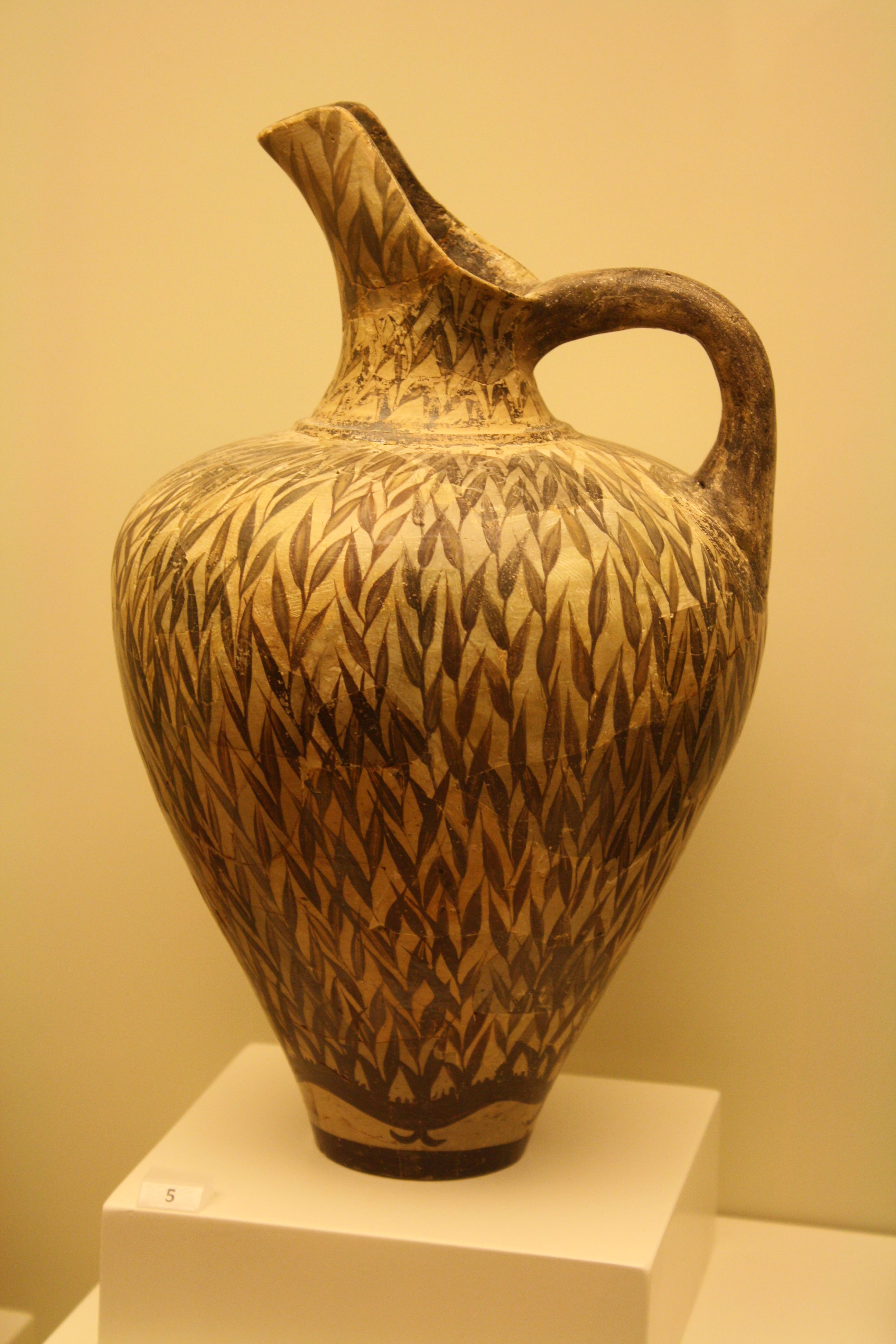 Late New-Palace period (1450 BCE) clay jug with distinctive leaf pattern, from Phaistos. (Heraklion Archaeological Museum, Crete)