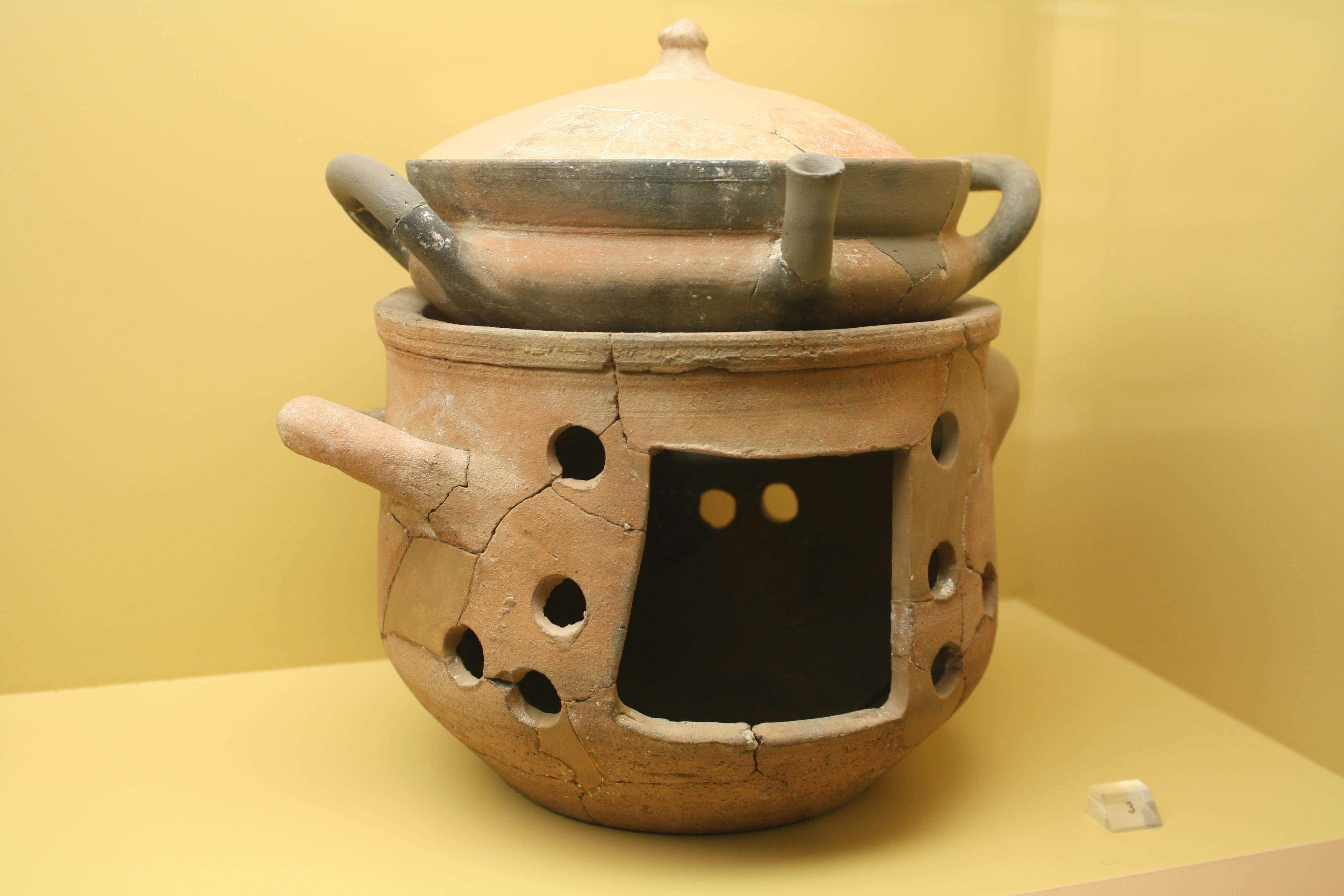 A spouted casserole dish (lopas) including lid and resting upon a brazier. Terracotta, 6th-4th centuries BCE. (Agora Museum, Athens)
