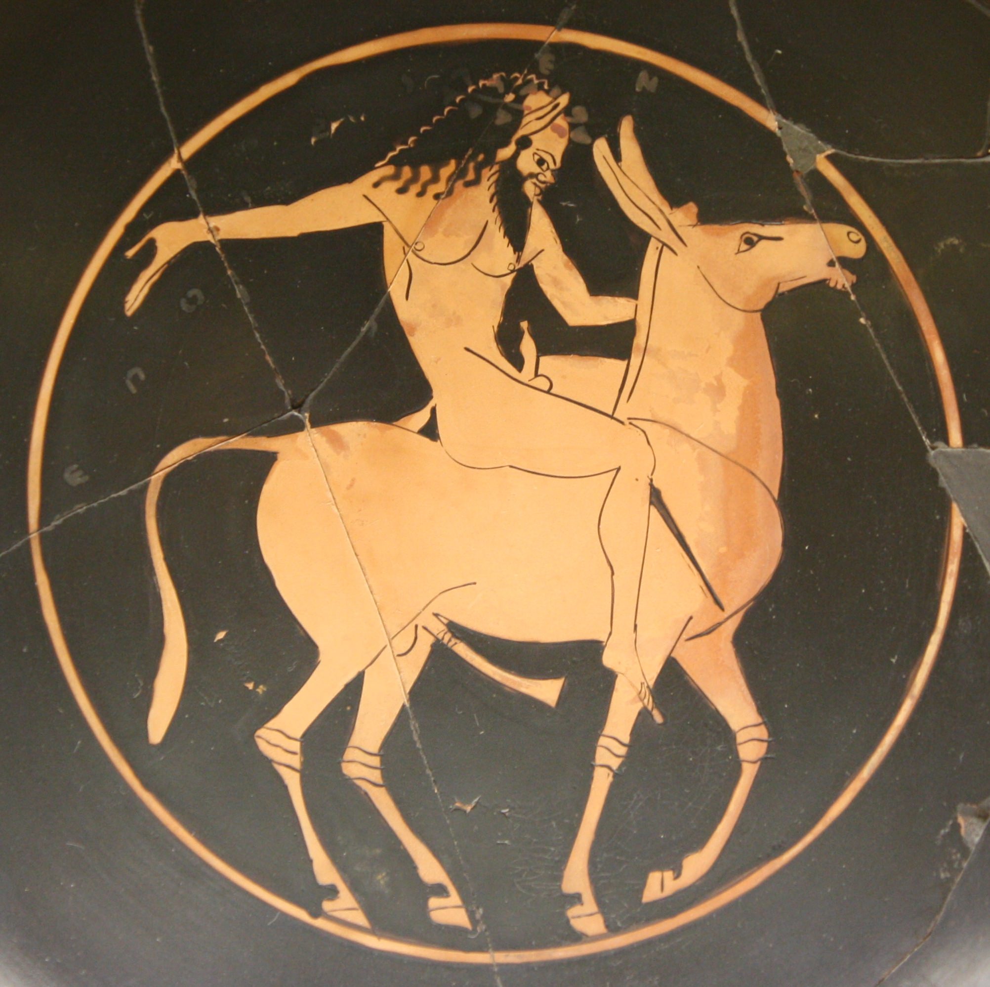 The tondo of a red-figure kylix depicting a Satyr riding a donkey. c. 510 BCE. (Agora Museum, Athens)