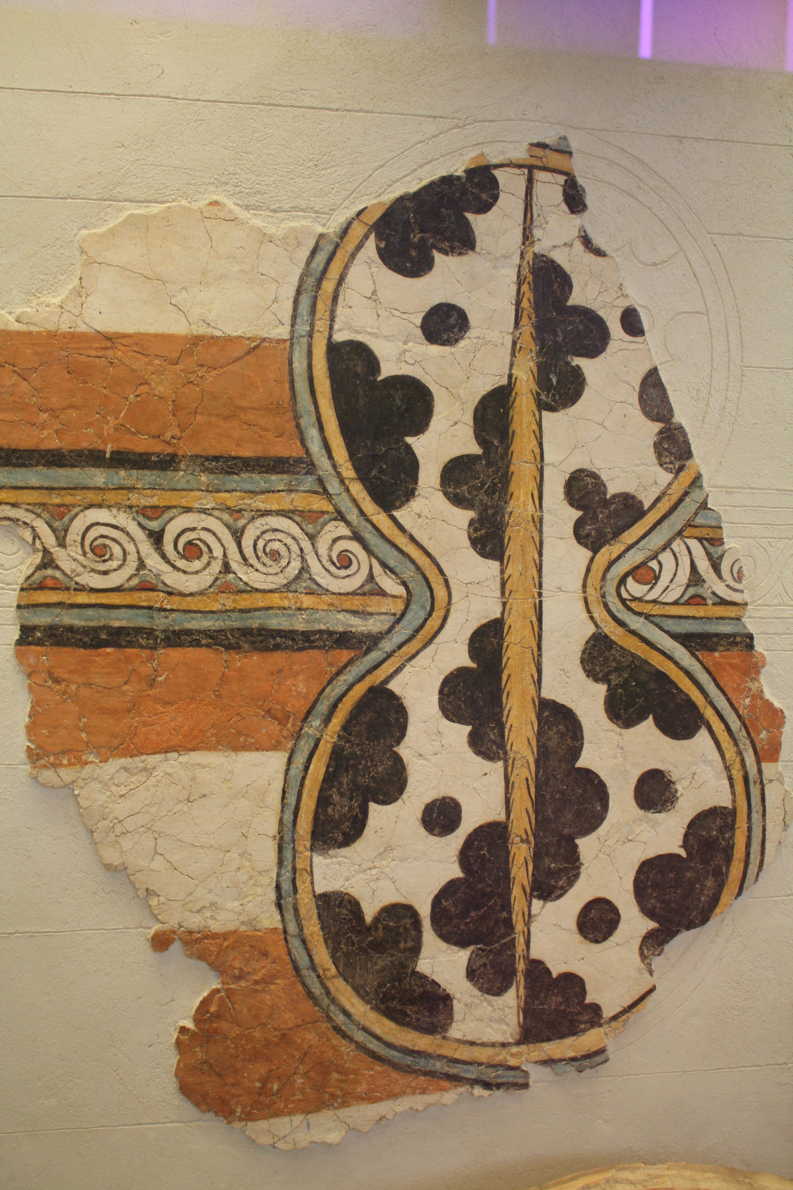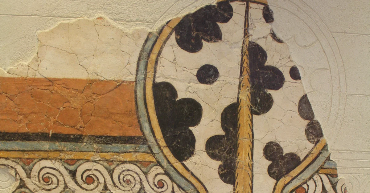 A fragment from a fresco from the acropolis of Mycenae depicting the typical figure-of-eight shield design. 15th century BCE. (National Archaeological Museum, Athens)