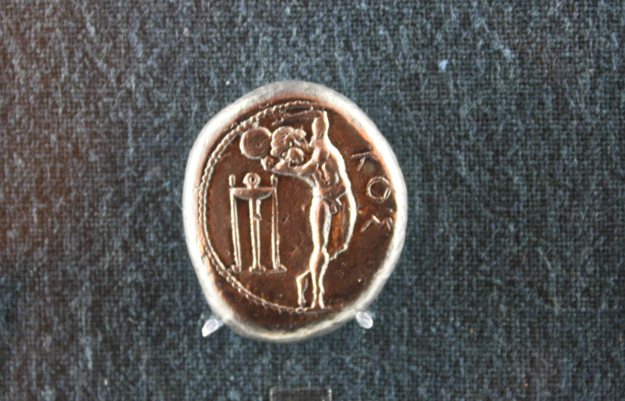 A silver tridrachm from Kos. A discus thrower (diskobolus) and tripod. 5th century BCE. (Numismatics Museum, Athens)