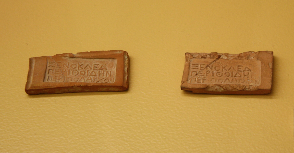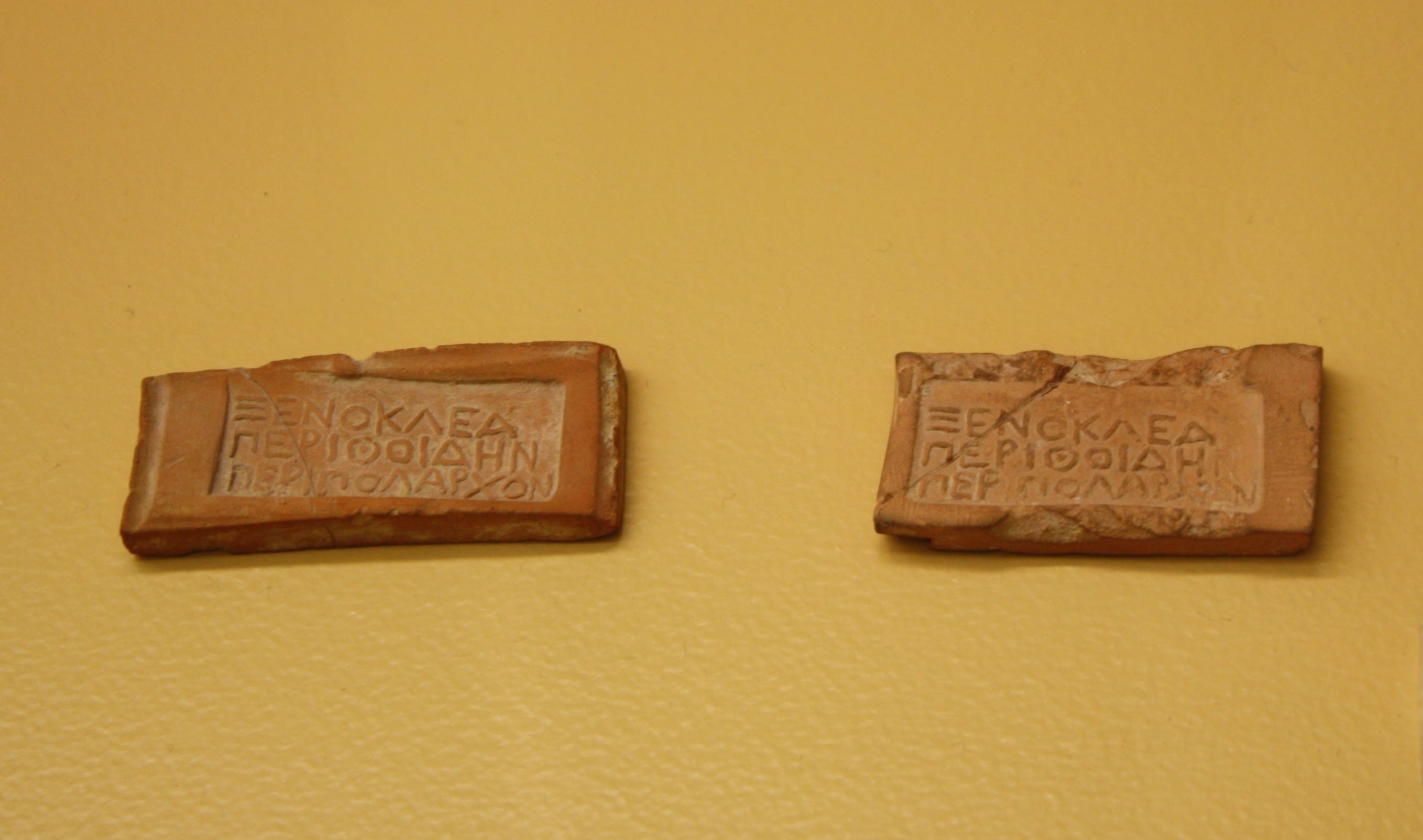 Clay tokens probably used as passports by travellers or messengers reporting between military headquarters. Belonging to Xenokles, a border commander, 4th century BCE. (Agora Museum, Athens)