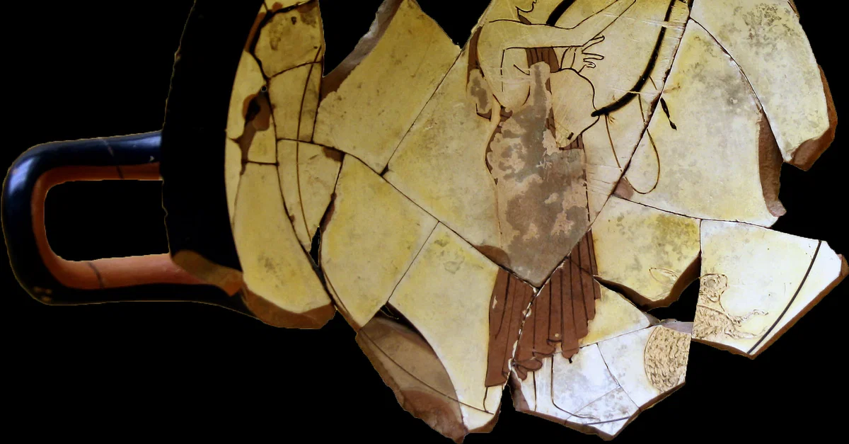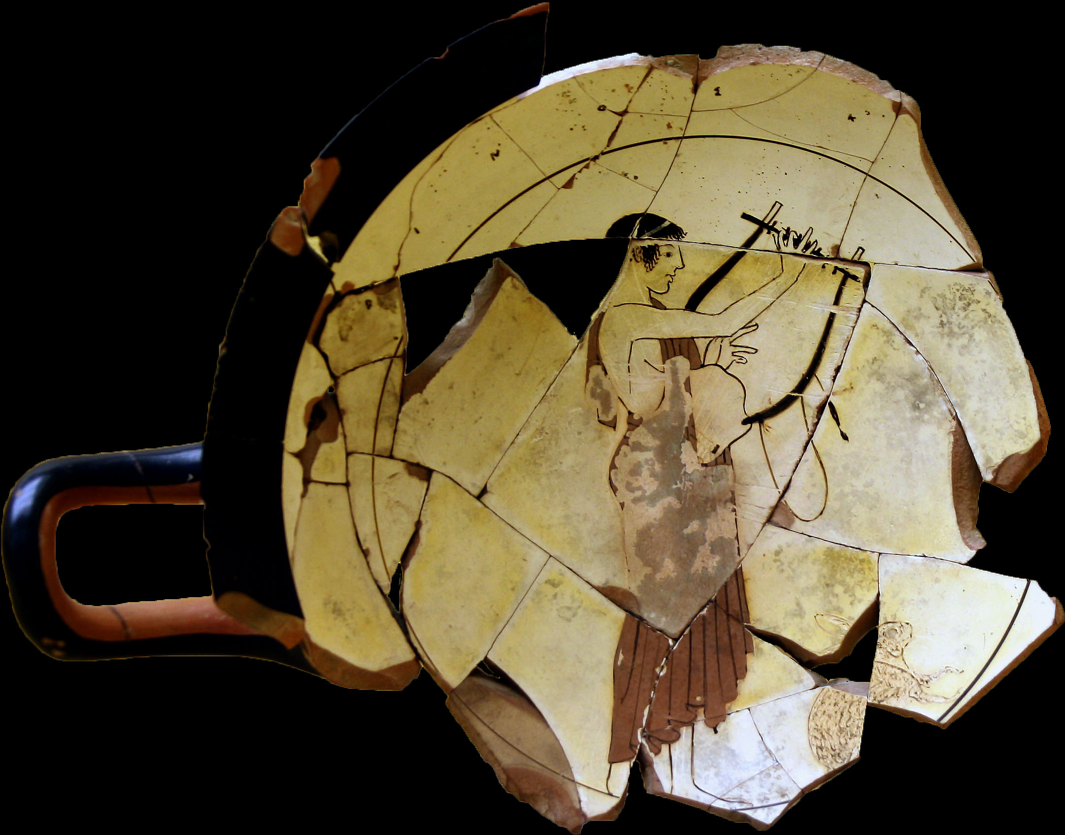 A young male tunes his tortoise-shell lyre, and a hare waits in anticipation. Fragmentary Kylix, c. 480 BCE. (Museum of the Ancient Agora, Athens)
