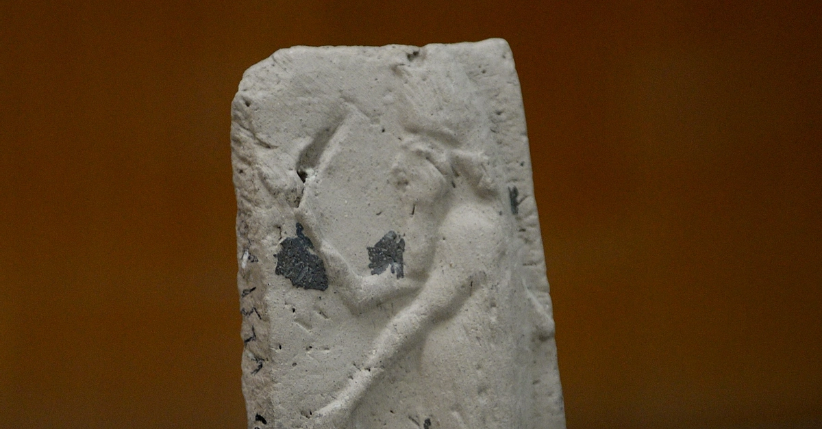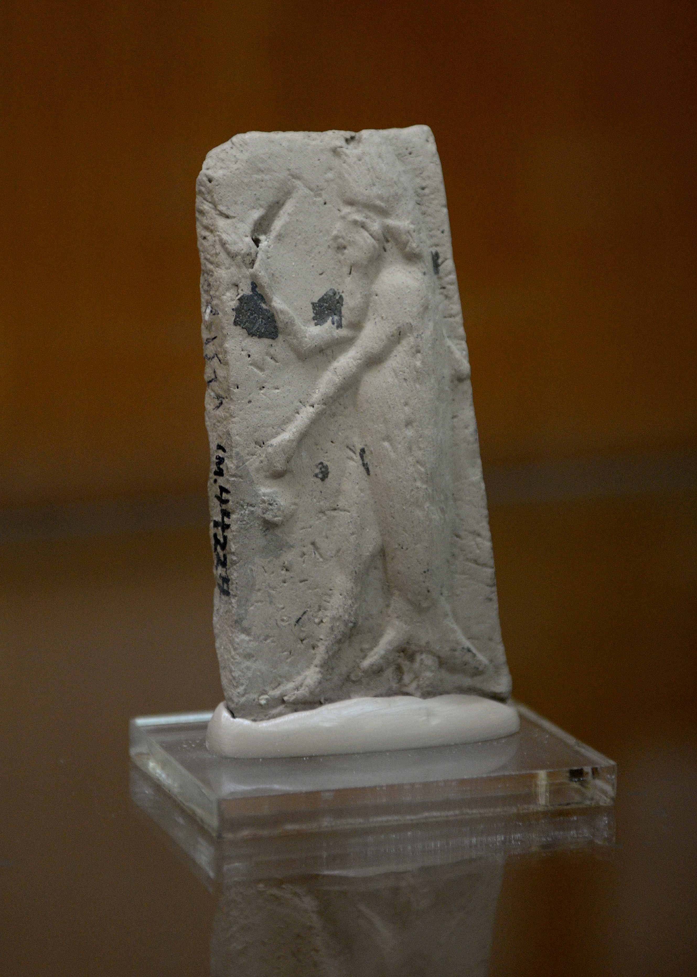 This terracotta plaque depicts an Apkallu. The figure is standing and wears a fish cloak. His right hand is raised and holds a cone while the left hand holds a bucket. Neo-Assyrian period, 911-609 BCE. From Mesopotamia, Iraq. The Sulaymaniyah Museum, Iraq.