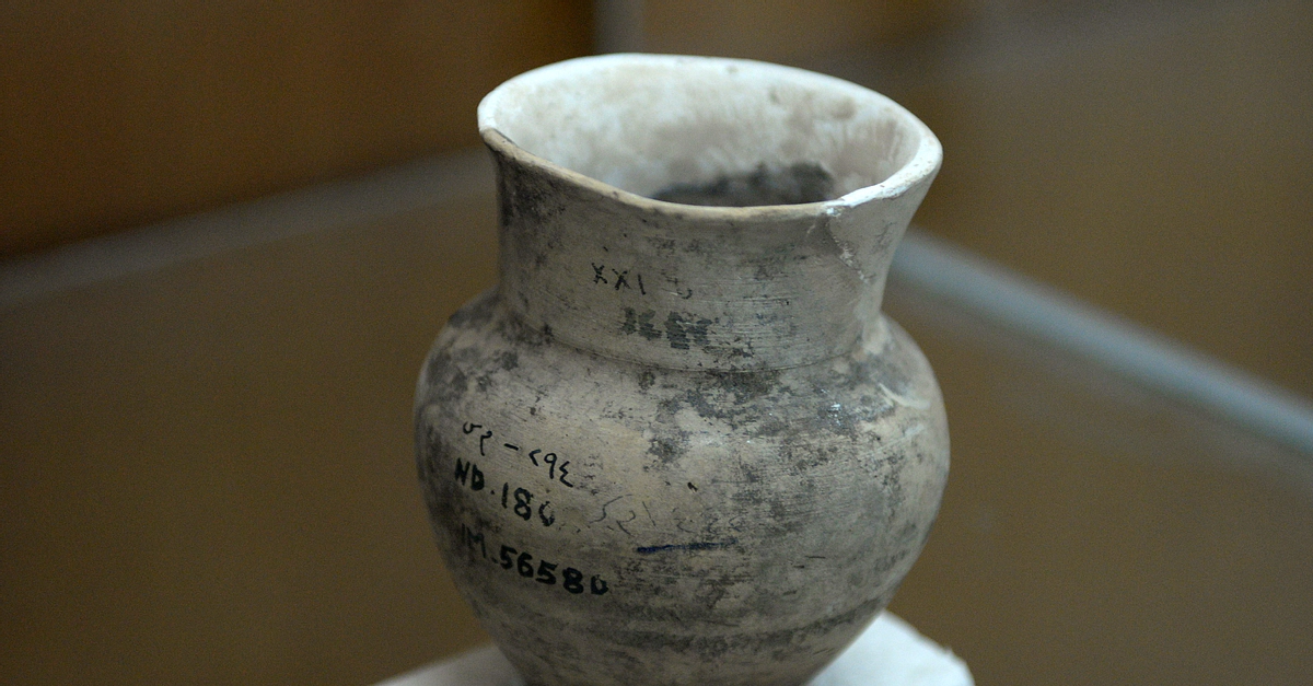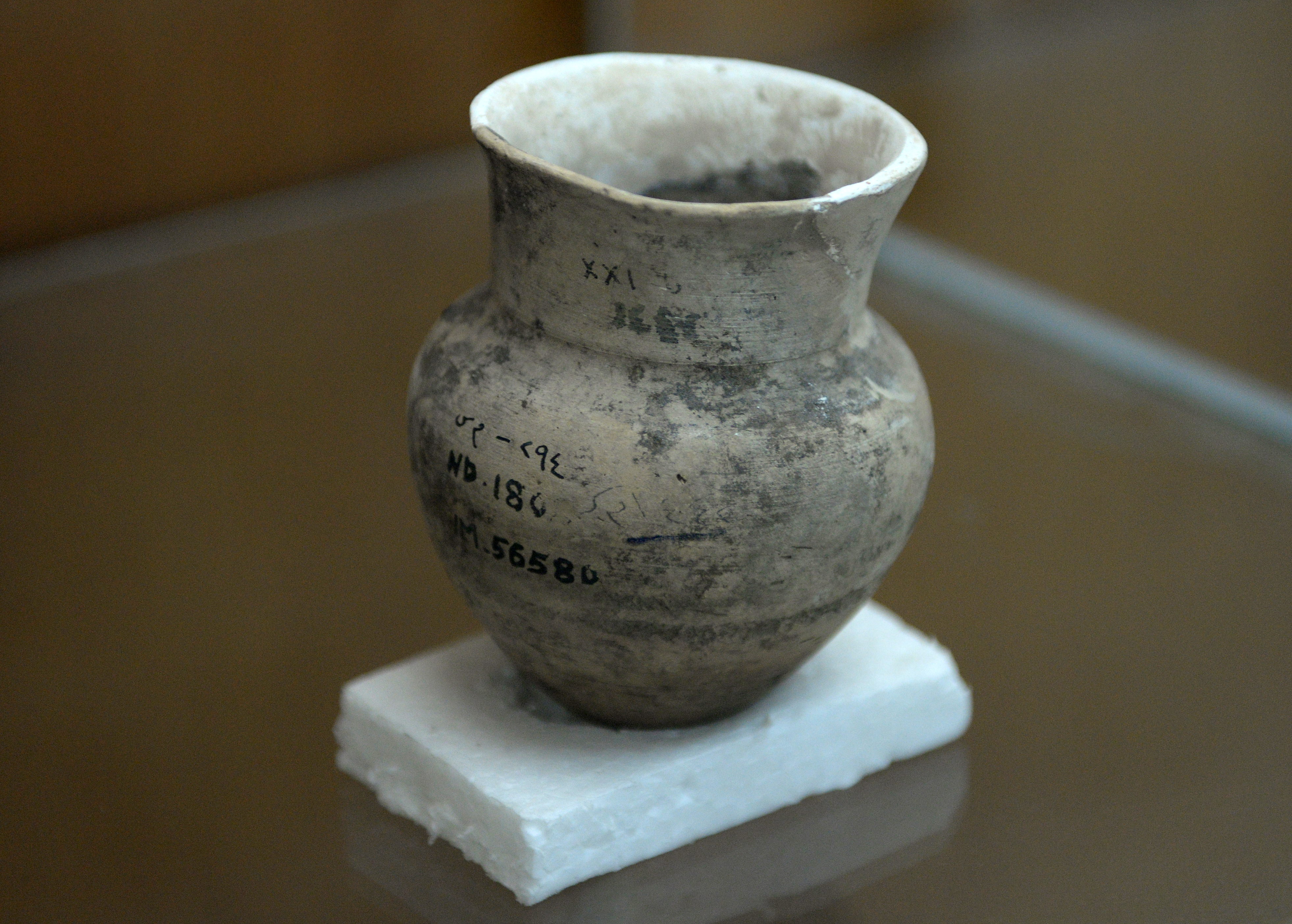 This pottery was found in the city of Nimrud (the Assyrian capital), northern Mesopotamia, Iraq. Note the writings and acquisition numbers on it. Neo-Assyrian period, 911-609 BCE. From Mesopotamia, Iraq. The Sulaymaniyah Museum, Iraq.