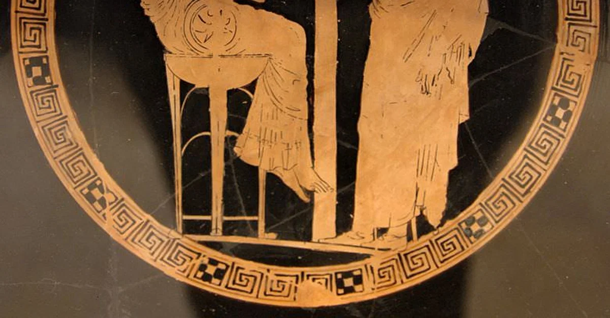 Themis and Aegeus. Attic red-figure kylix, from Vulci, 440-430 BCE.