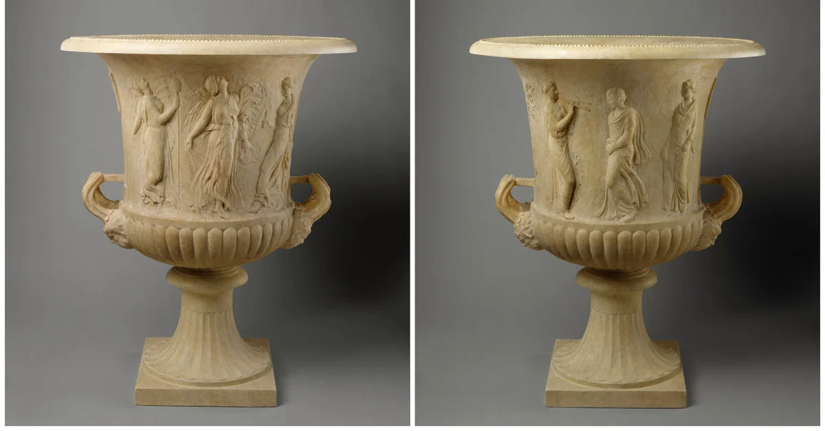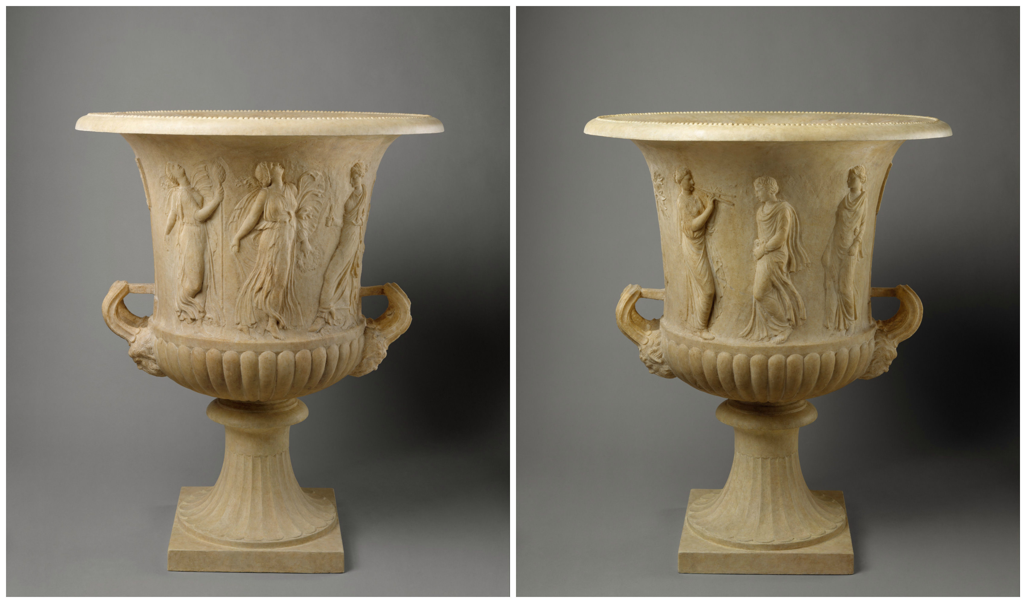 "The peristyle courtyards and gardens of the villas belonging to wealthy Romans were filled with fountains, sculpture, and monumental ornaments such as this vase. Many of these decorative works were eclectic combinations of shapes and motifs drawn from the long, rich tradition of Greek art that had been produced some five hundred years earlier in the sixth and fifth centuries B.C. The six female figures that surround this vase are copies and adaptations taken from famous classical reliefs. On one side, two modestly wrapped maidens approach a girl playing a double flute, while on the other side, three maenads, followers of Dionysos, dance in abandon to the music of wooden clappers. Gnarled trees above the handles evoke an outdoor setting." Roman, 1st century CE. Height: 80.7 cm New York Metropolitan Museum of Art, Rogers Fund, 1923, 23.184.