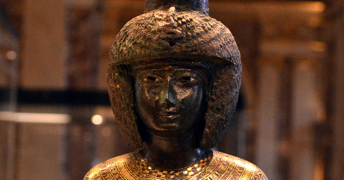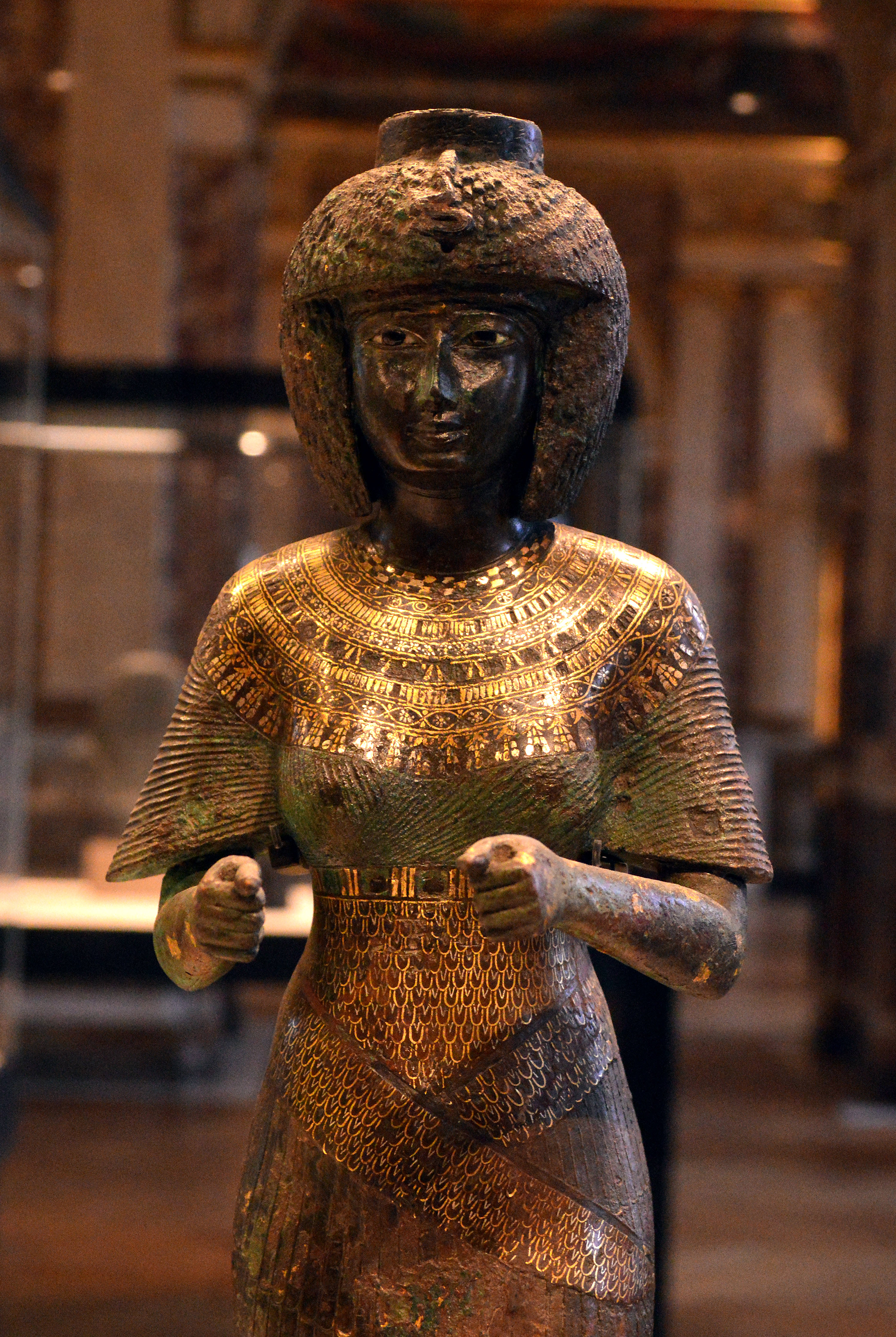 Bronze statue of Queen Karomama I, "Divine Worshipper of Amun", wife of Osorkon II of the 22nd Dynasty of Egypt. The statue was made c. 850 BCE and is made of bronze covered with gold, silver, and electrum. It is dedicated to Iahentefnakht, for "perpetuating the name of my mistress in the temple of Amun-Ra".