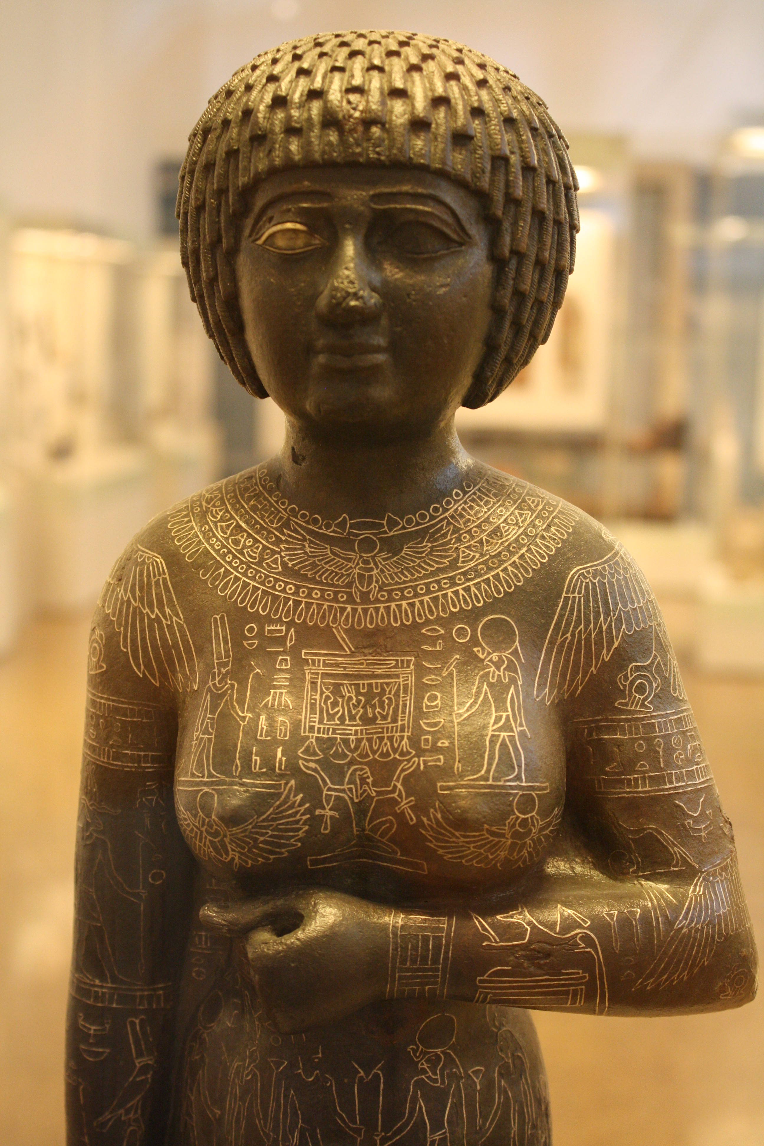 Copper alloy with precious metal inlay statue of Egyptian priestess Takushit. 25th Dynasty, c. 670 BCE. Found near Alexandria. (National Archaeological Museum, Athens)
