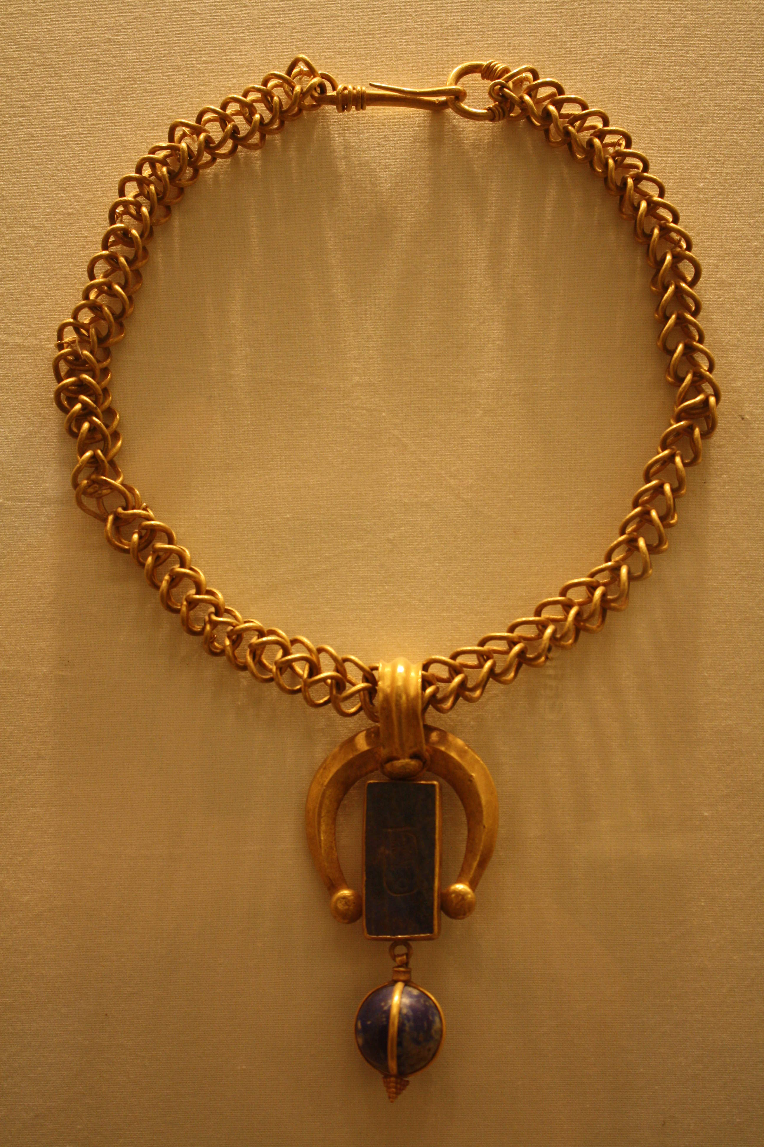 A gold and lapiz lazuli necklace from Egypt, New Kingdom, 1550-1075 BCE. (National Archaeological Museum, Athens)