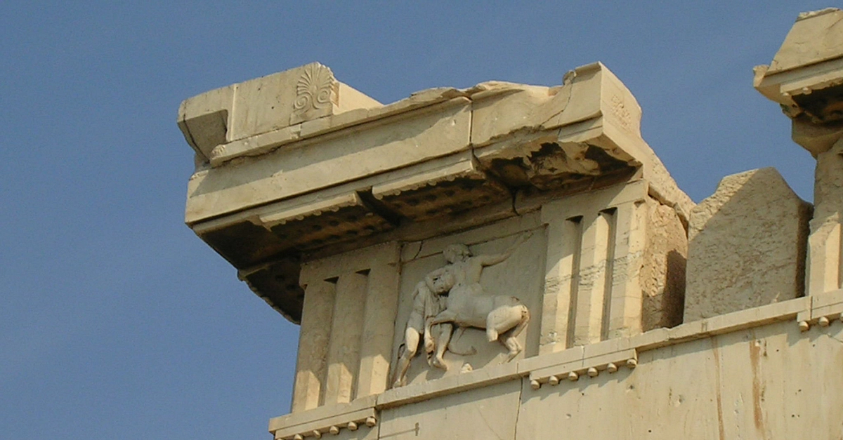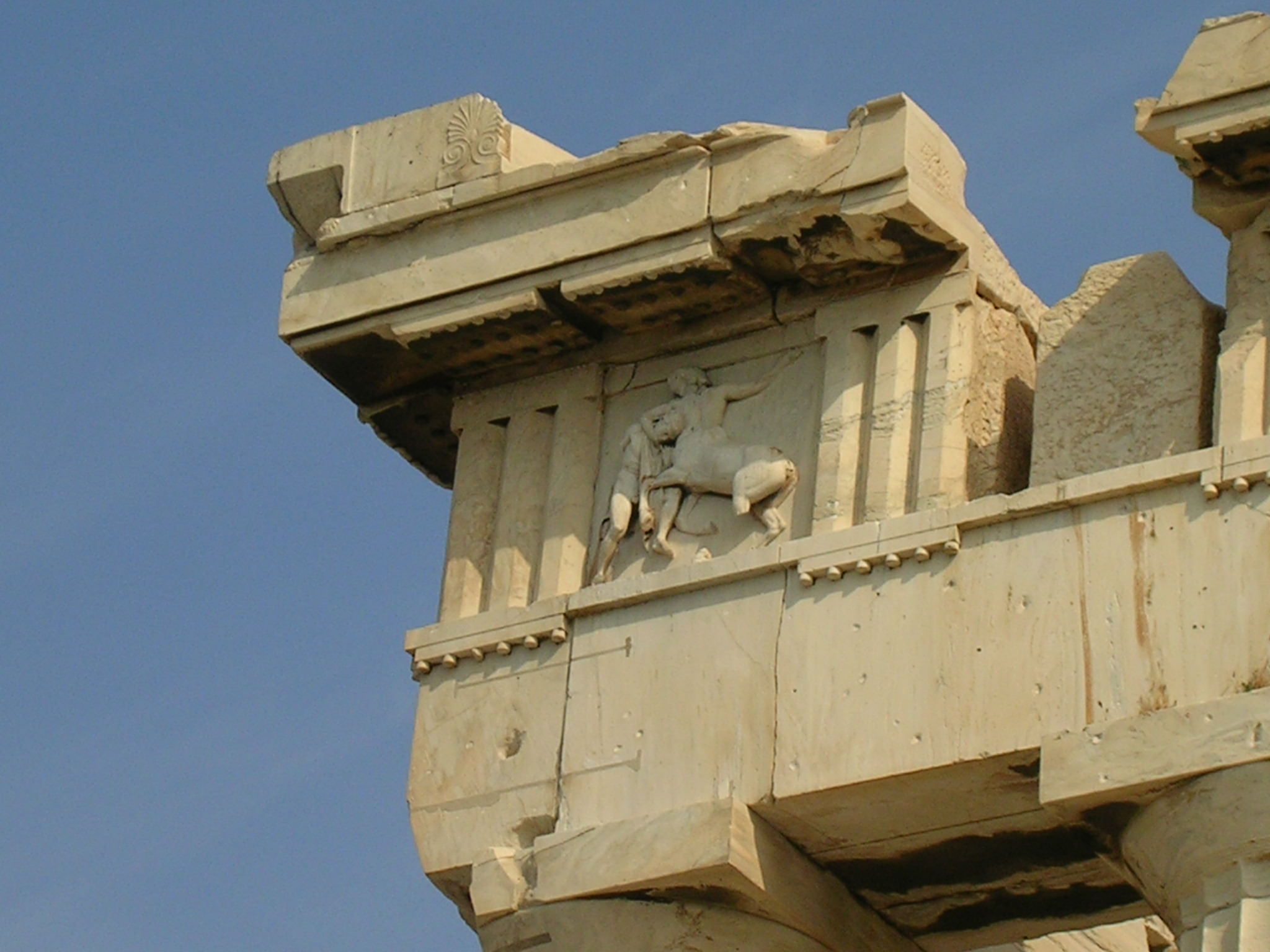 Entablature detail from the 5th century BCE Parthenon, Athens. Above the column capitals lies the abacus which supports the entablture. This latter element consists of the architrave, frieze and cornice. Here the frieze carries triglyphs (with vertical grooves) and between them sculpted metopes.