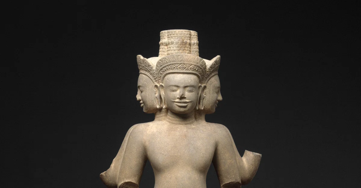 A sandstone statue of the Hindu god Brahma. The god is in typical pose with four faces representing his creation of the four Vedas in Hindu mythology. 1.20 m tall. Cambodia, 10th century CE. (Metropolitan Museum of Art, New York)