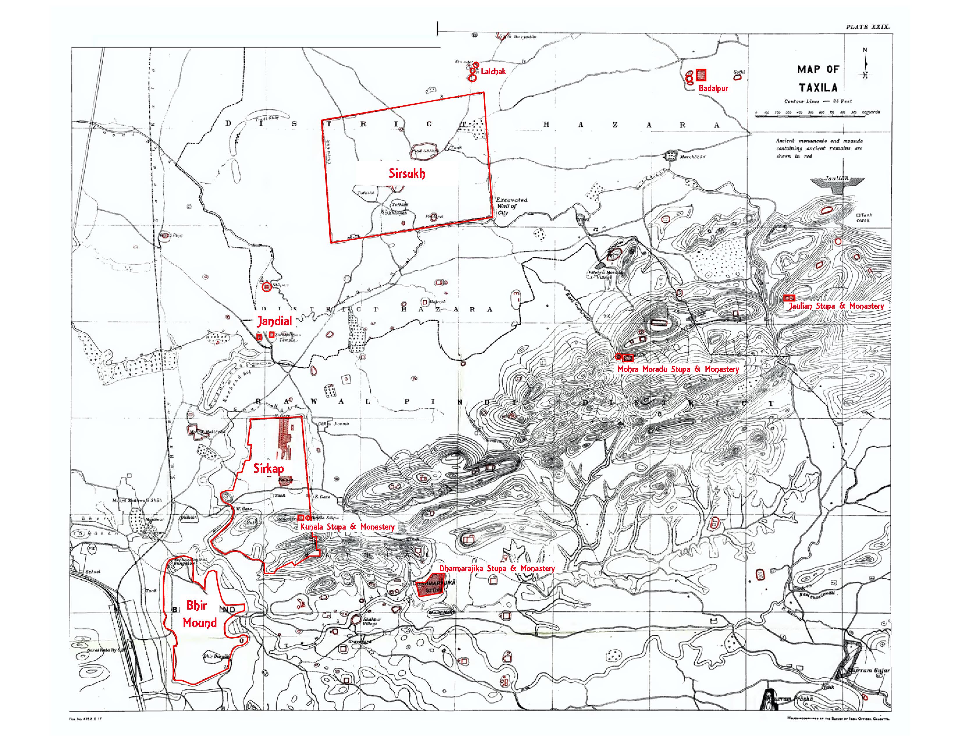An early 20th Century map of Taxila showing the various archaeological sites in red by Sir John Marshall