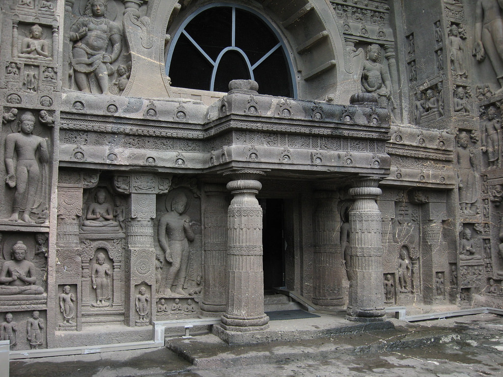 The chaitya facade of Cave 19, Ajanta, north-west Deccan, India. The columned porch, cushion column capitals, and ornate decorative sculpture are typical of Gupta architecture (4-6th century CE). The relief panels show scenes from the life of Buddha.