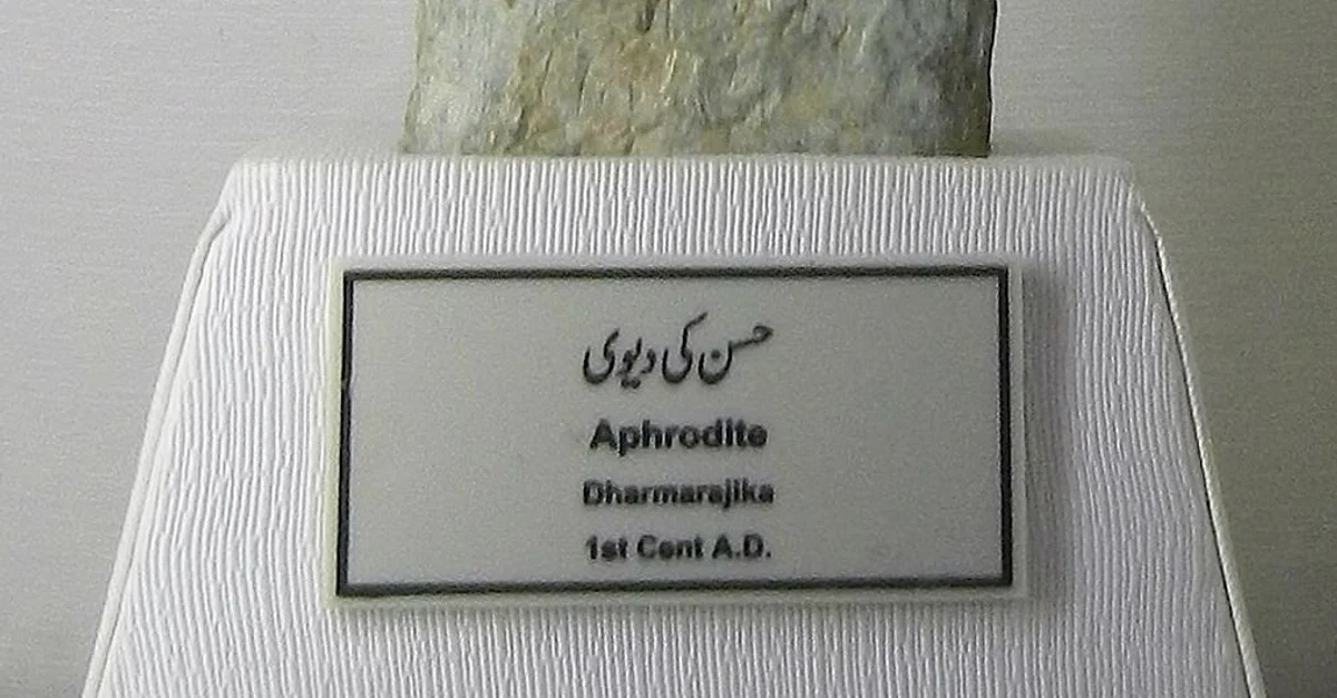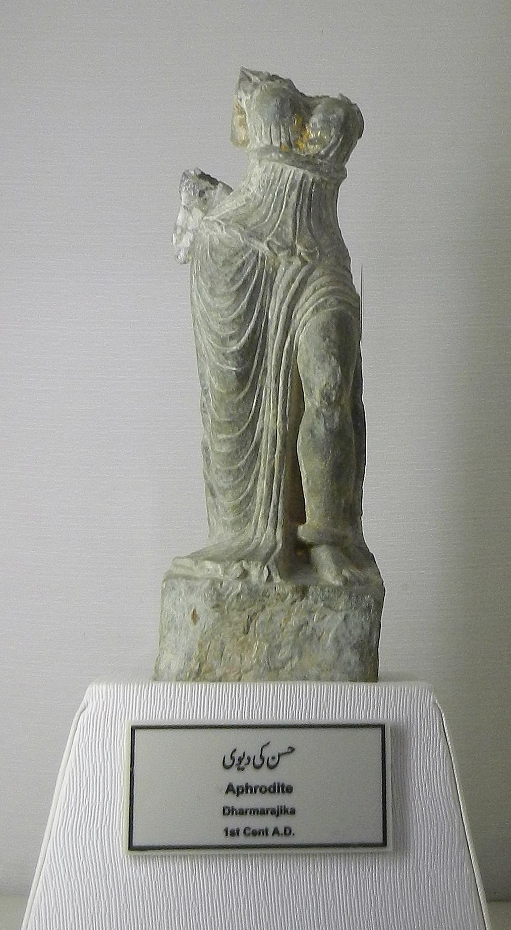 Schist stone sculpture representing Aphrodite. The statue showcases the Indianized proportions of the Greek deity. Found at Dharmarajika Stupa. 1st century CE. (Taxila Museum, Punjab, Pakistan)