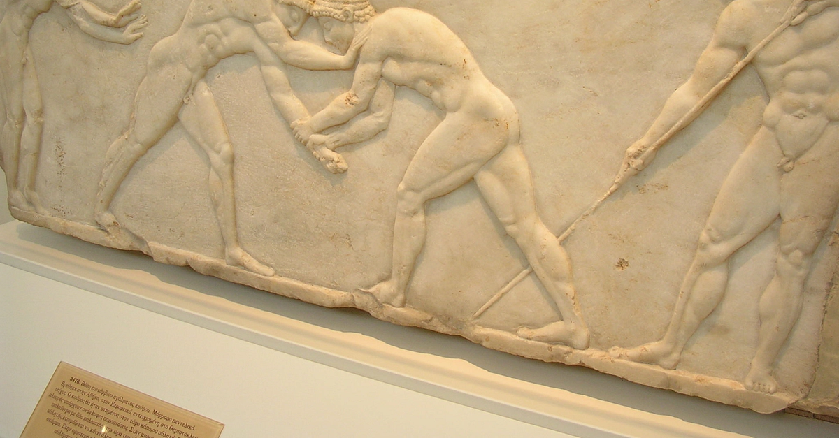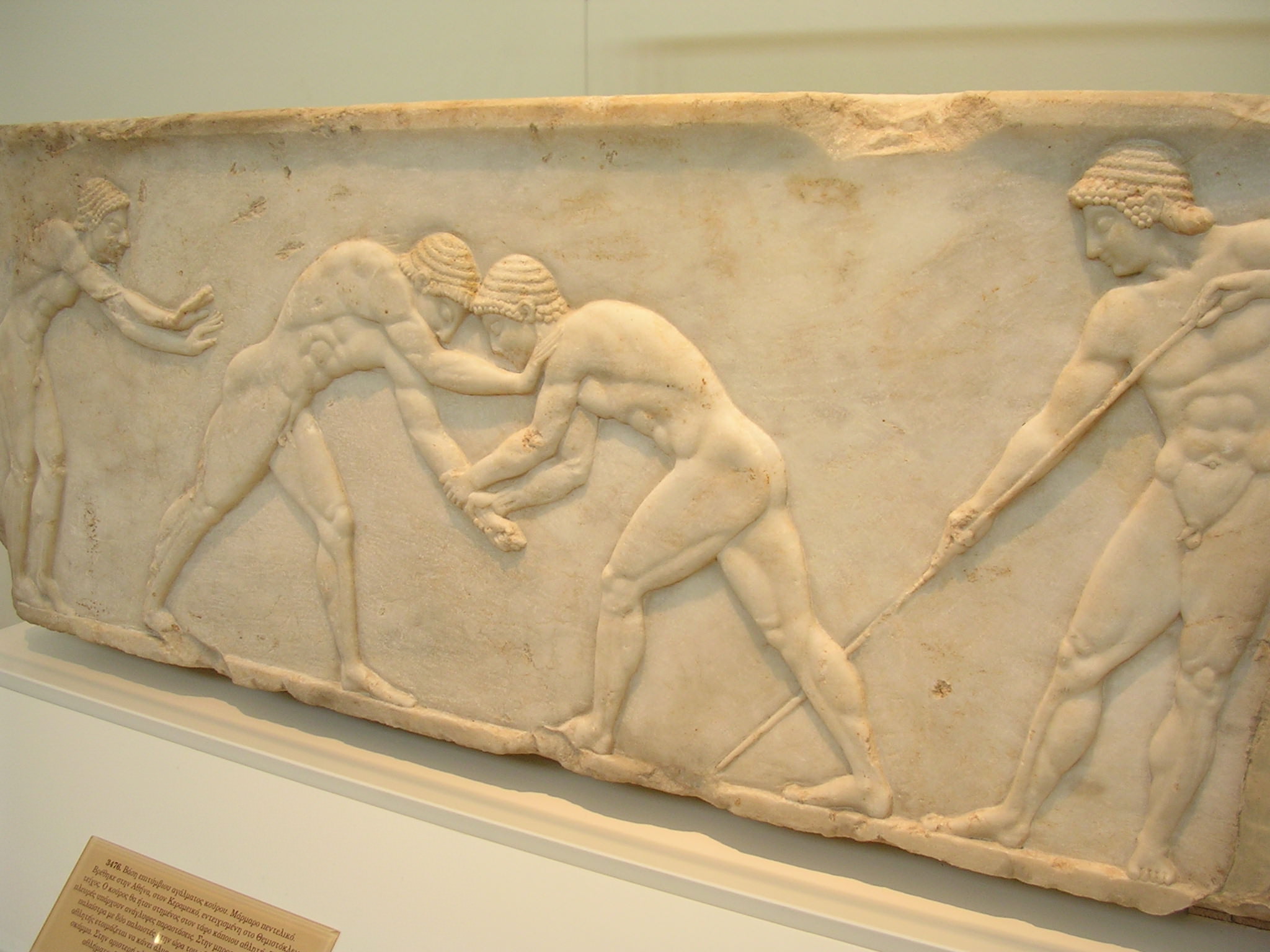 A detail of a wrestling scene, c. 510 BCE from the base of a funerary kouros. (National Archaeological Museum, Athens)