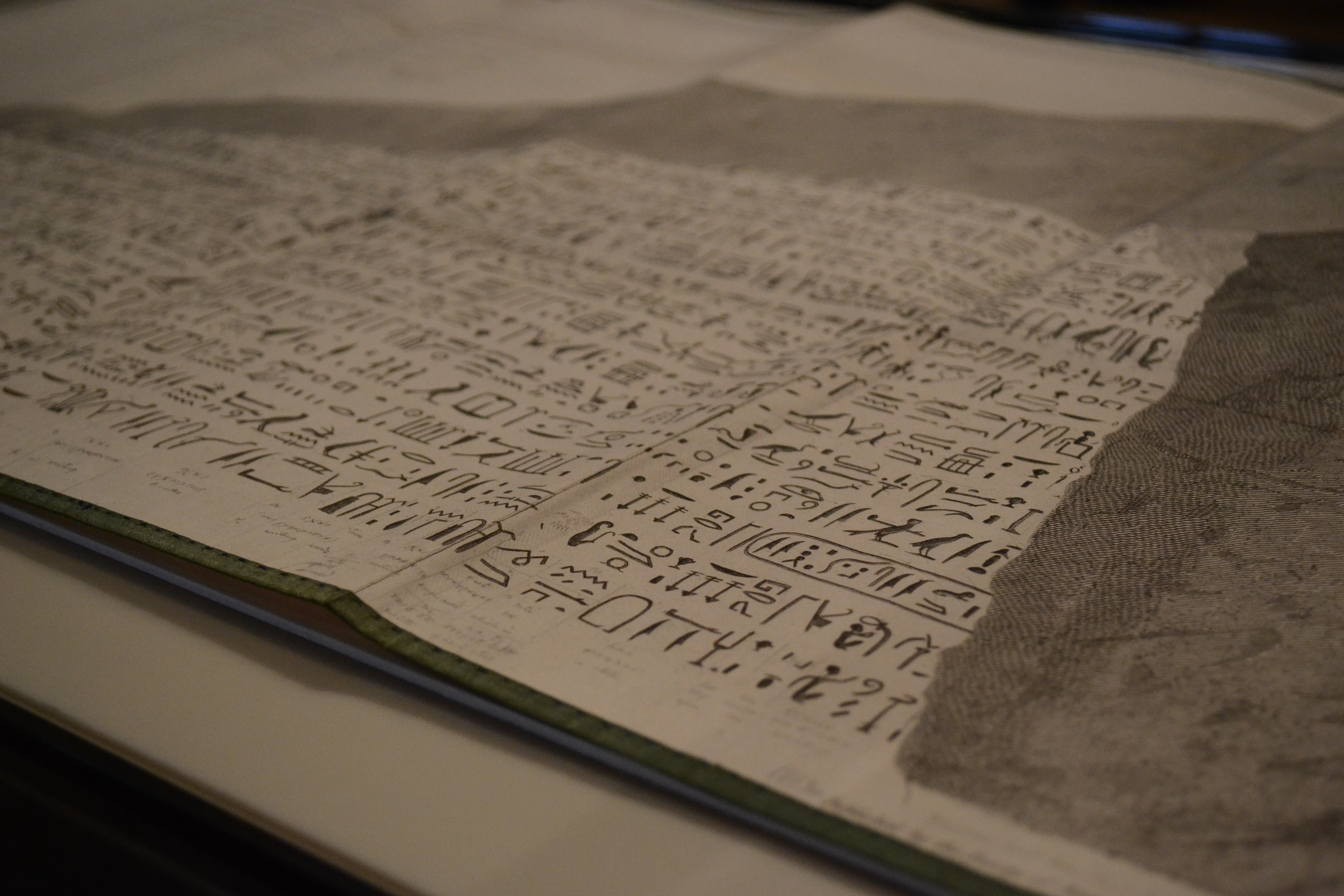 This is a copy of the Rosetta Stone with some hand notes made by Jean-François Champollion. This photo was taken at the Neues Museum, Berlim.