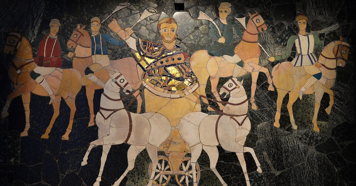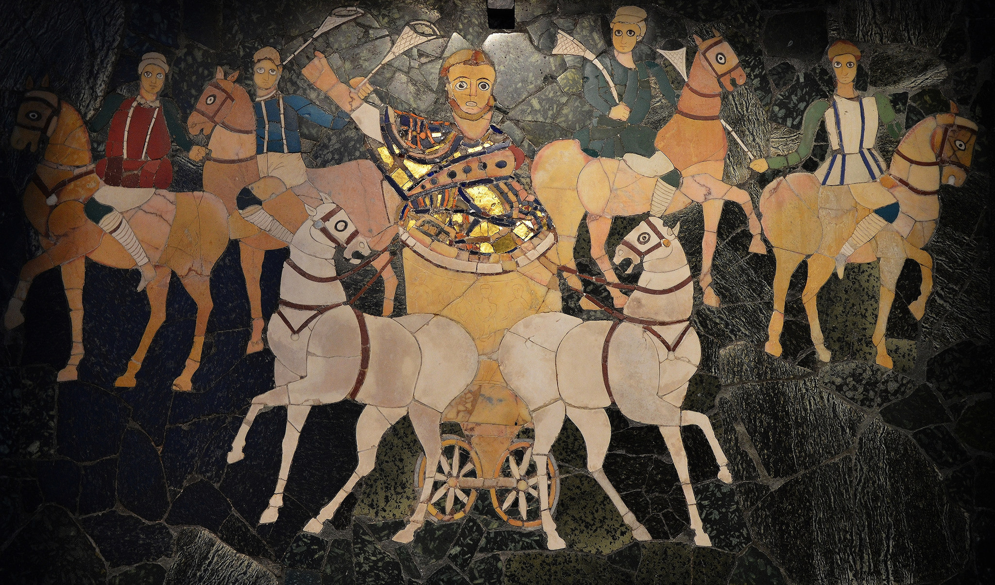 Opus sectile panel (made of precisely cut polished varicolored marble) from the Basilica of Junius Bassus, which stood on the Esquiline Hill in Rome. The panel, dating from the 4th century CE, represents the processus consularis (a procession for the appointment of a consul) of Junius Bassus on a biga (two-horse chariot) followed by four horsemen representing the factions of the circus.