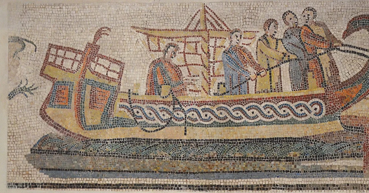 Roman mosaic from Veii (Isola Farnese, Italy) depicting an African elephant being loaded onto a ship, 3rd-4th century CE. Now in Badisches Landesmuseum Karlsruhe, Germany.
