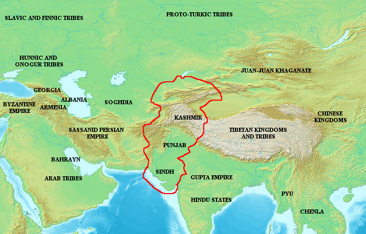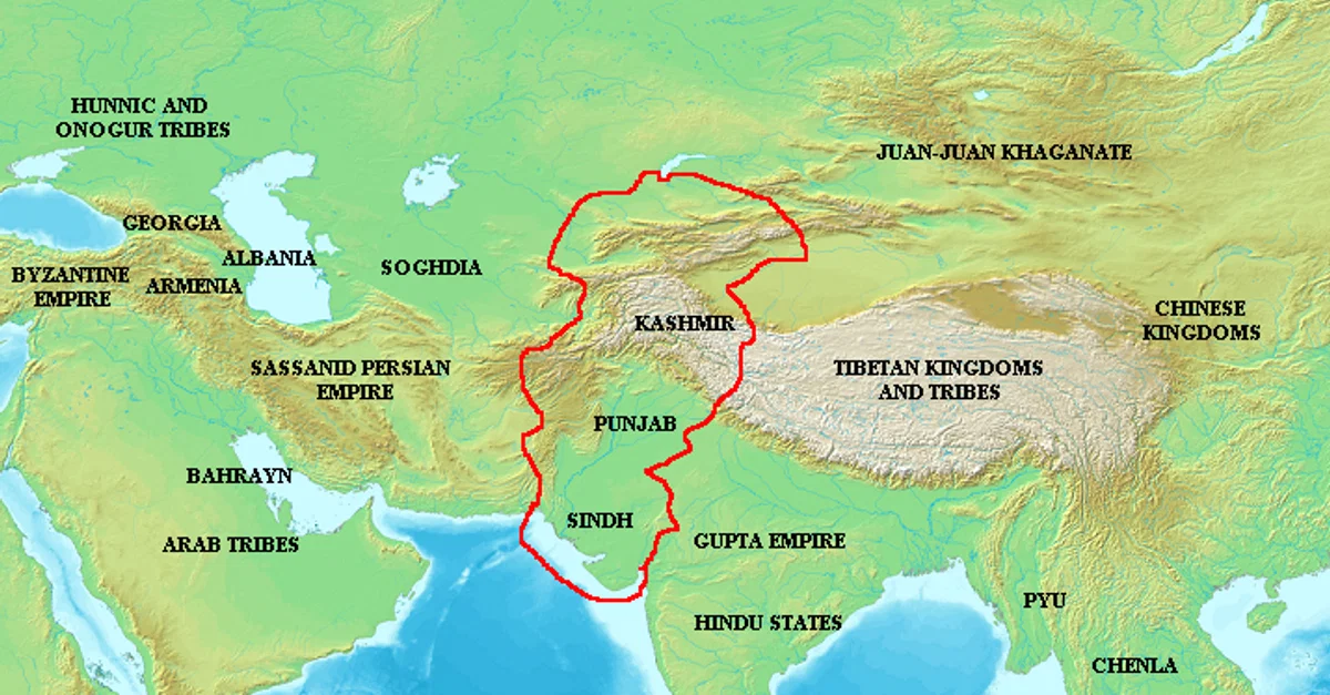 A map indicating in red the area of influence and control by the White Huns (Hephthalites) c. 500 CE.