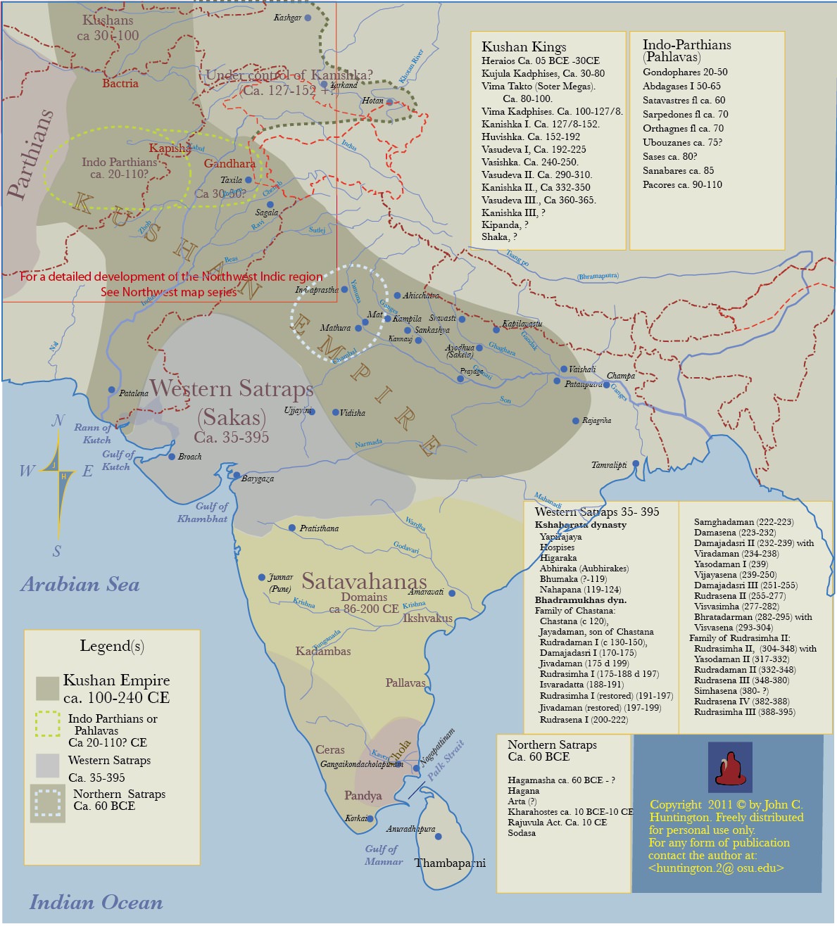This map shows the extent of the Kushan empire along with the various states and kingdoms that surrounded it at roughly the same time period. c. 100 - 240 CE.