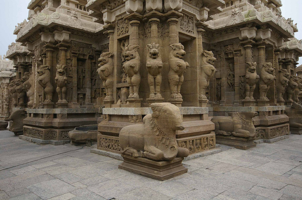 Nandi and lion sculptures on the the early 8th century CE Kailasanatha temple at Kanchipuram, Tamil Nadu, southern India.