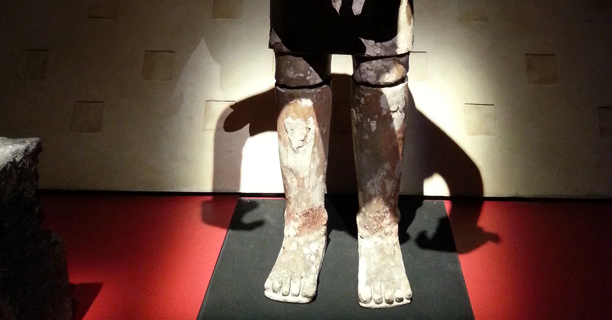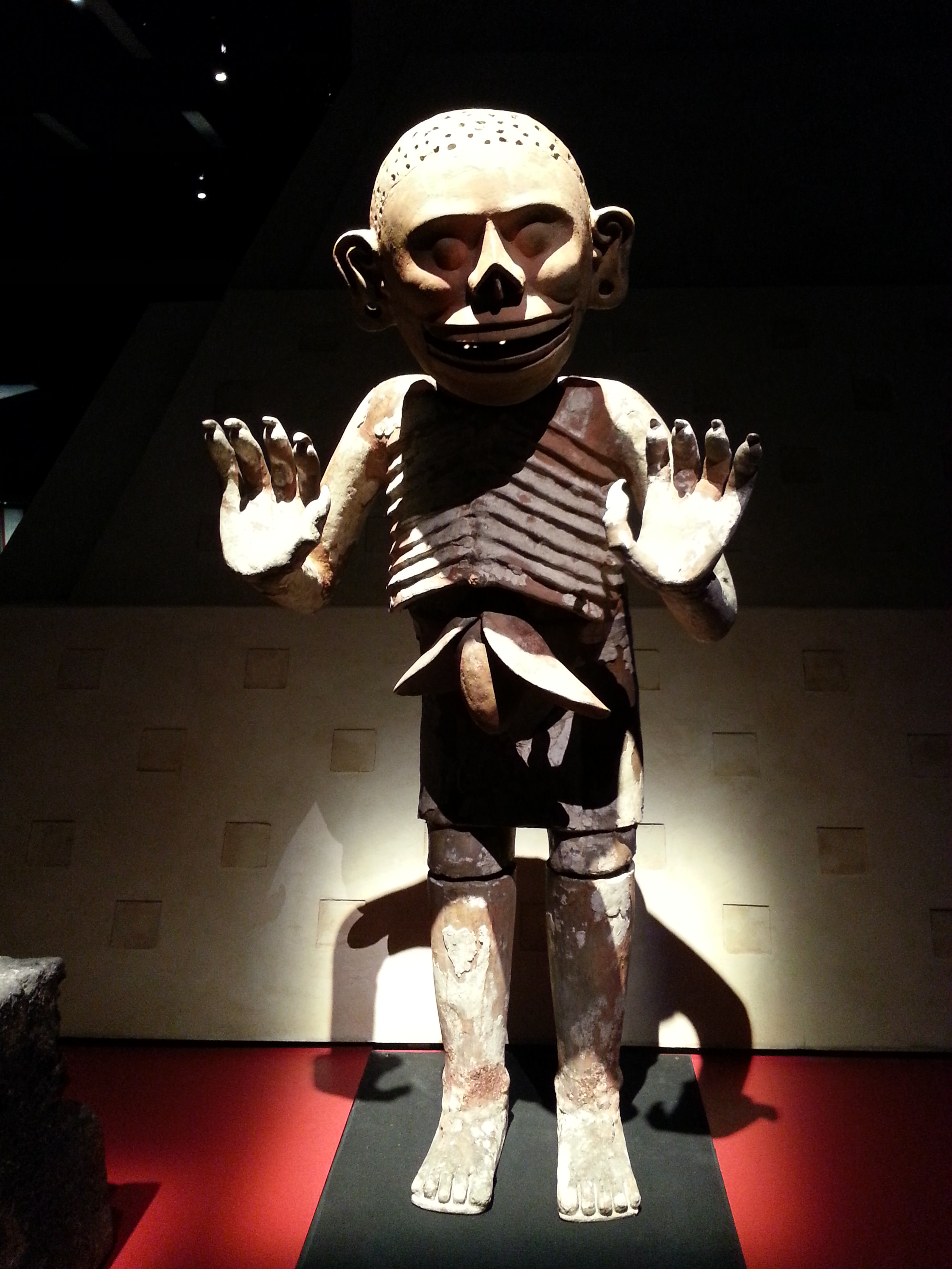 Sculpture of the Aztec God of Death, Mictlantecuhtli. The terracotta sculpture is tall and almost life-sized. 14-16th century CE. (Melbourne Museum, Melbourne)