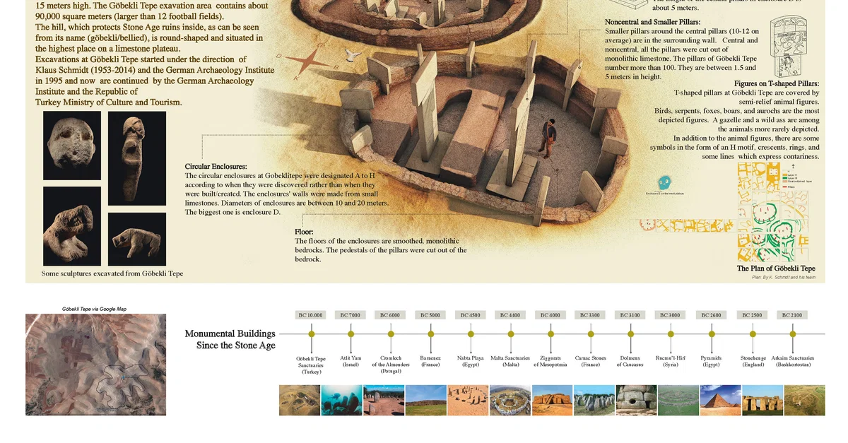 This infographic explores the excavation area at Göbekli Tepe, with maps, illustrations, images, and a timeline. Click on the image to zoom in.