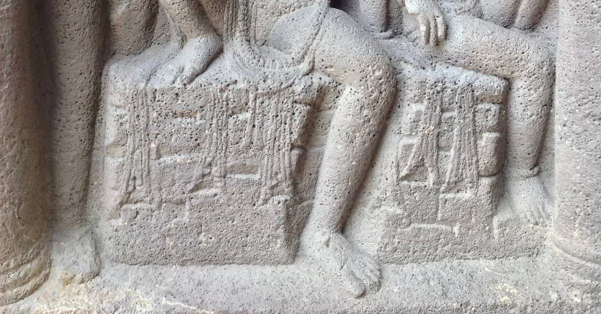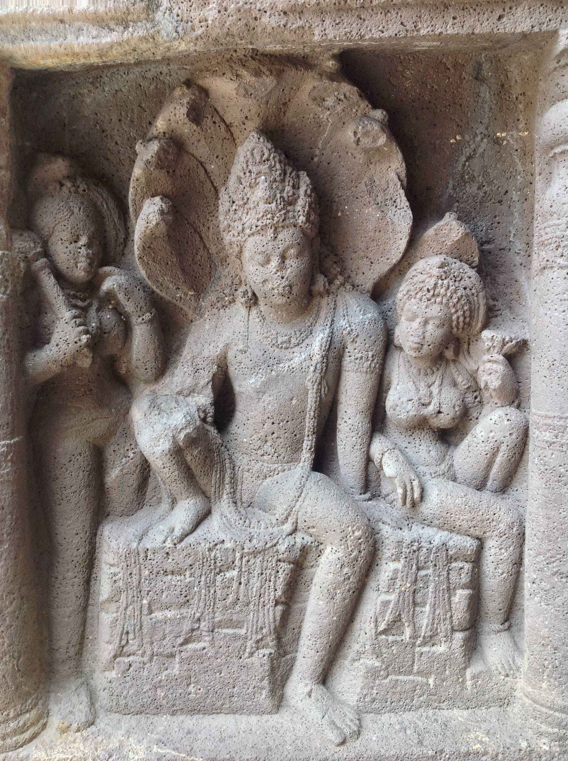 The Nagaraja - or Snake King - possibly represents either a mythical figure from Buddhist mythology, a figure from the Jataka Tales of Buddhist literature, or the headman of the local snake-worshiping tribe that lived in the same region as the ancient Buddhists of Ajanta at the time of this particular cave's construction. This is a detail from a wall carving in one of the outer caves of the Ajanta cave complex, an ancient Buddhist monastery and UNESCO World Heritage Site located in the Aurangabad District of Maharashtra, India. Originally built from the 2nd century BCE, with additional caves added in subsequent centuries, the Ajanta cave complex contains some of the finest surviving examples of ancient Indian and Buddhist religious art and architecture in the Indian subcontinent.