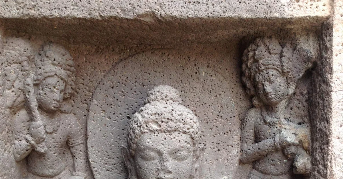 Here, the figure seated in the lotus position features two important details: first, a halo, indicating that Prince Siddhartha has attained Enlightenment and so has become the "Buddha", or the Enlightened One, and second, the Dharmachakra Mudra, a hand gesture that represents the "Wheel of Dharma", symbolizing an important occasion in the life of the Buddha; the delivery of his first sermon to his followers after his Enlightenment in the Deer Park at Sarnath, in northern India. By bringing the thumb and index fingers of each hand together to form a circle, the Buddha sets into motion the Dharmachakra Mudra, or Wheel of Dharma, symbolizing the interconnectedness and interdependence of all life, existence and consequence by way of the laws of Dharma. Additionally, each of the extended fingers of each hand represents a Buddhist virtue or teaching, and the placement of the Mudra in front of the chest symbolizes that these teachings emanate from the Buddha's heart. This is a detail from one of the outer walls of the Ajanta cave complex, an ancient Buddhist monastery and UNESCO World Heritage Site located in the Aurangabad District of Maharashtra, India. Originally built from the 2nd century BCE, with additional caves added in subsequent centuries, the Ajanta cave complex contains some of the finest surviving examples of ancient Indian and Buddhist religious art and architecture in the Indian subcontinent.