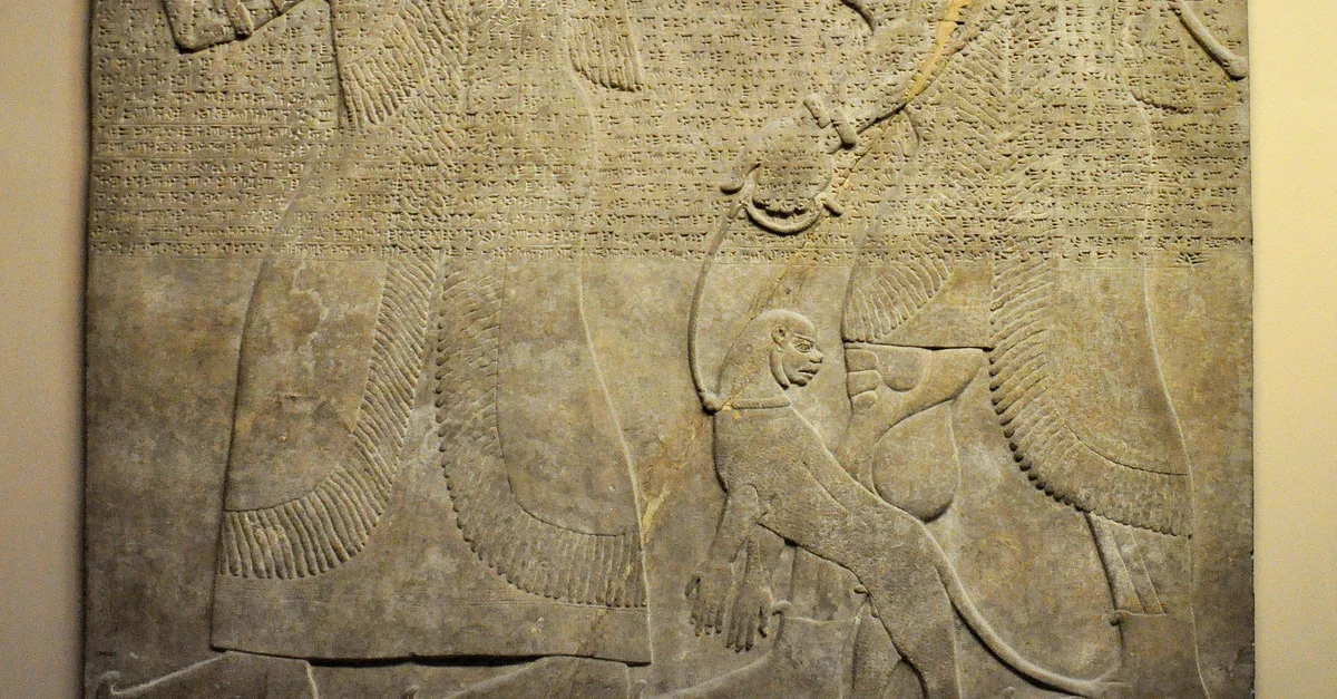 This alabaster bas-relief was placed on the facade of the throne room. It depicts 2 men as tribute bearers. The one of the left wears a turban of a kind worn in the north-west Syrian territories; he raises his hands in token of submission. The second man behind him, most likely a Phoenician, brings a pair of monkeys. The Assyrian kings, in general, enjoyed exotic animals. The "standard inscription" of Ashurnasirpal II runs horizontally across the relief. From court D, panel 7, the north-west palace of the Assyrian king Ashurnasirpal II at Nimrud (ancient Kalhu; Biblical Calah). From Mesopotamia, modern-day Iraq. Neo-Assyrian period, 865-860 BCE. The British Museum, London.