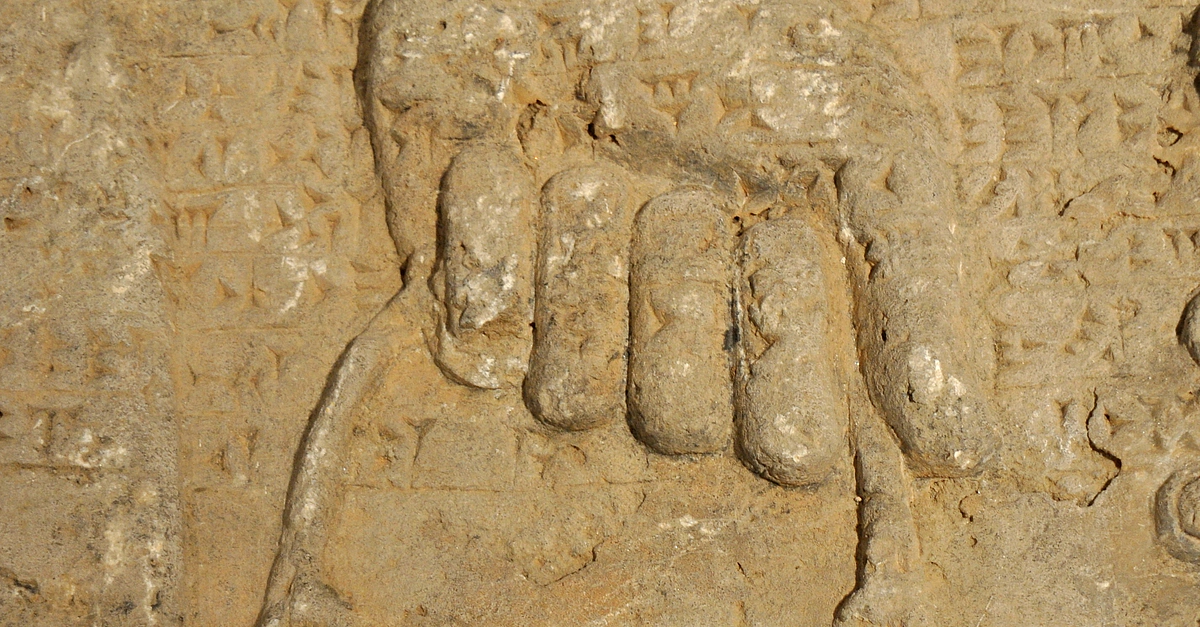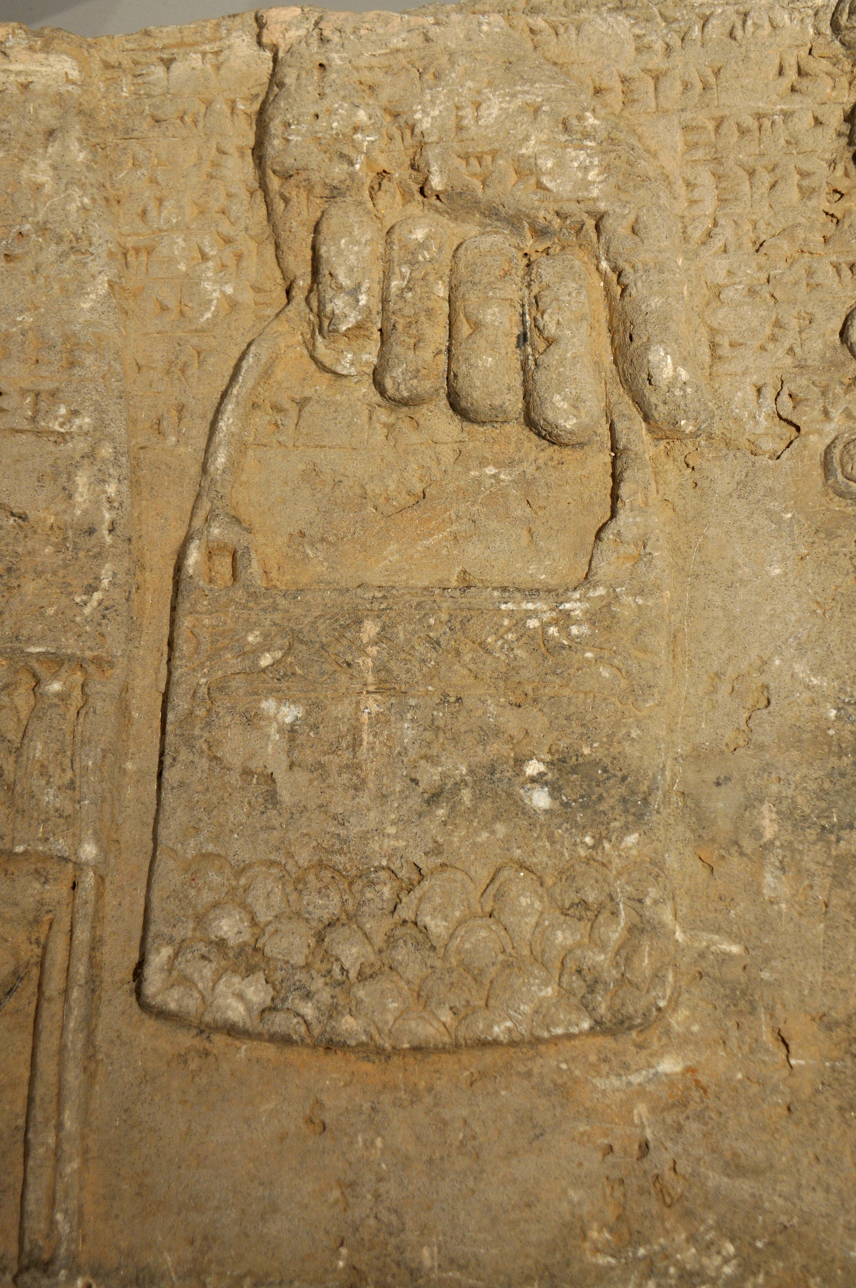 This is a close-up image of an Assyrian bucket (banduddu) held by a protective spirit (Apkallu). During certain ceremonies, this bucket was filled with a fluid and the Apkallu dips a pine cone (mullilu) into it; the Apkallu then sprinkles the Assyrian king and his courtiers to purify them. The "standard inscription" of Ashurnasirpal II runs horizontally across the upper part of the relief. From the north-west palace of the Assyrian king Ashurnasirpal II at Nimrud (ancient Kalhu; Biblical Calah). From Mesopotamia, modern-day Iraq. Neo-Assyrian period, 875-860 BCE. The Sulaymaniyah Museum, Iraq.