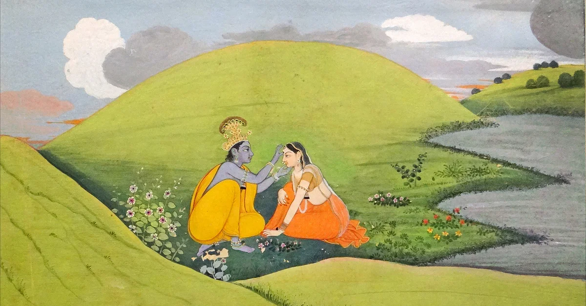 An idyllic scene depicting the Hindu hero Krishna and his wife Radha. 18th century CE opaque watercolour with gold on paper. (Musée Guimet, Paris)