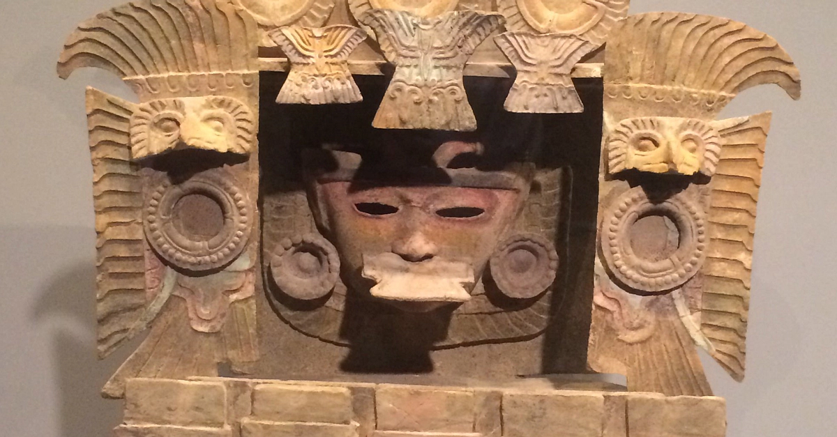 A painted ceramic incense burner from Teotihuacan, c. 350-450 CE. It is decorated with feather shields, birds, and butterflies in ceramic. (St. Louis Art Museum, Missouri)