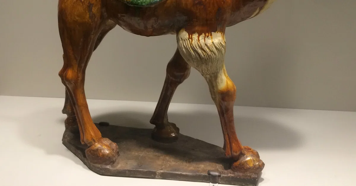A lead-glazed ceramic Bactrian camel from the Tang Dynasty. China, 8th century CE. (St. Louis Art Museum, Missouri)