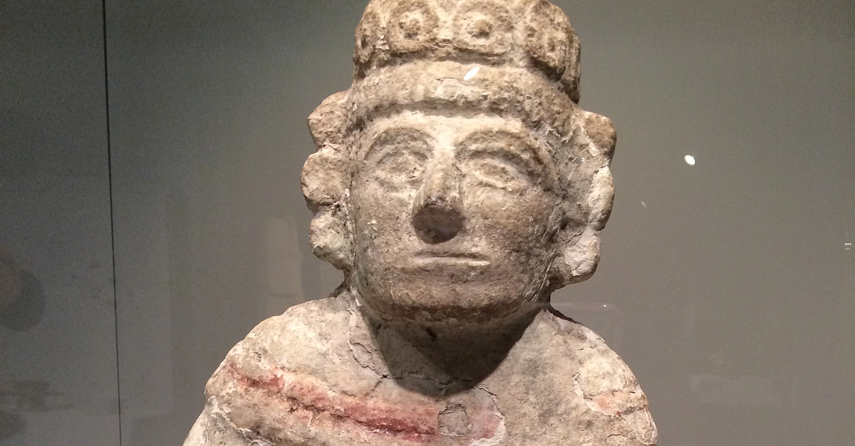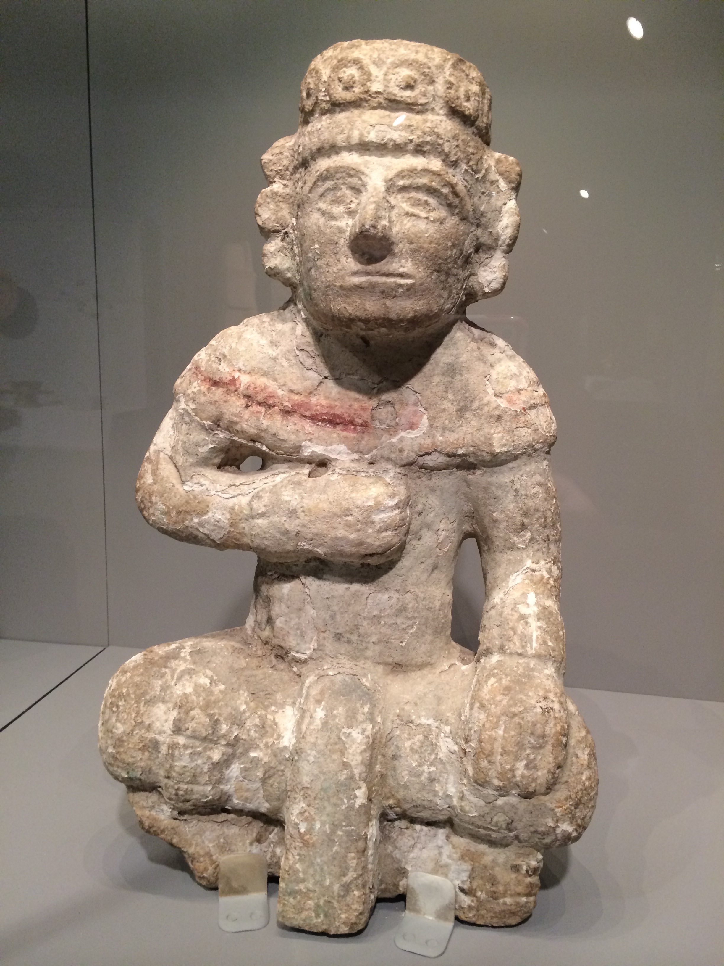 A seated Maya warrior. This stone and plaster figure is from the exterior of The Temple of the Warriors, Chichen Itza. Mexico, 1000-1100 CE. (St. Louis Art Museum, Missouri)