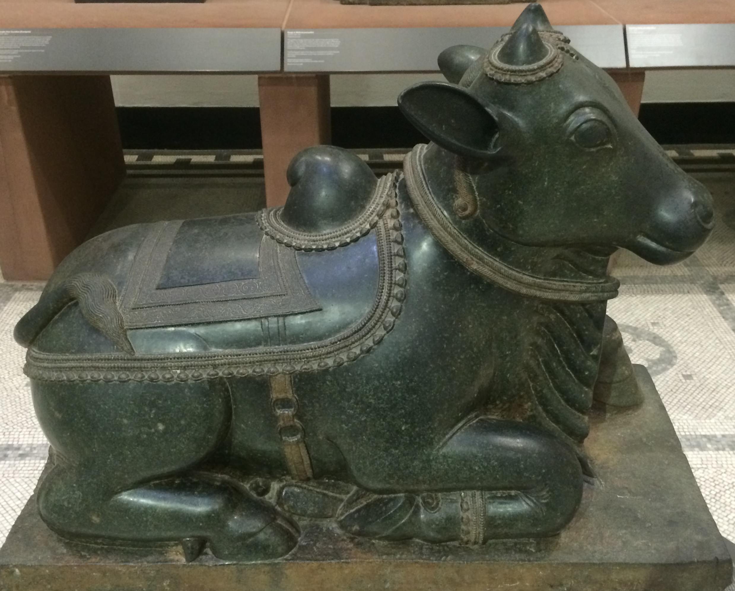 A serpentine stone sculpture of Nandi, the sacred bull calf and vehicle of the Hindu god Shiva. The Deccan, India, 1550-1650 CE. (Victoria & Albert Museum, London)