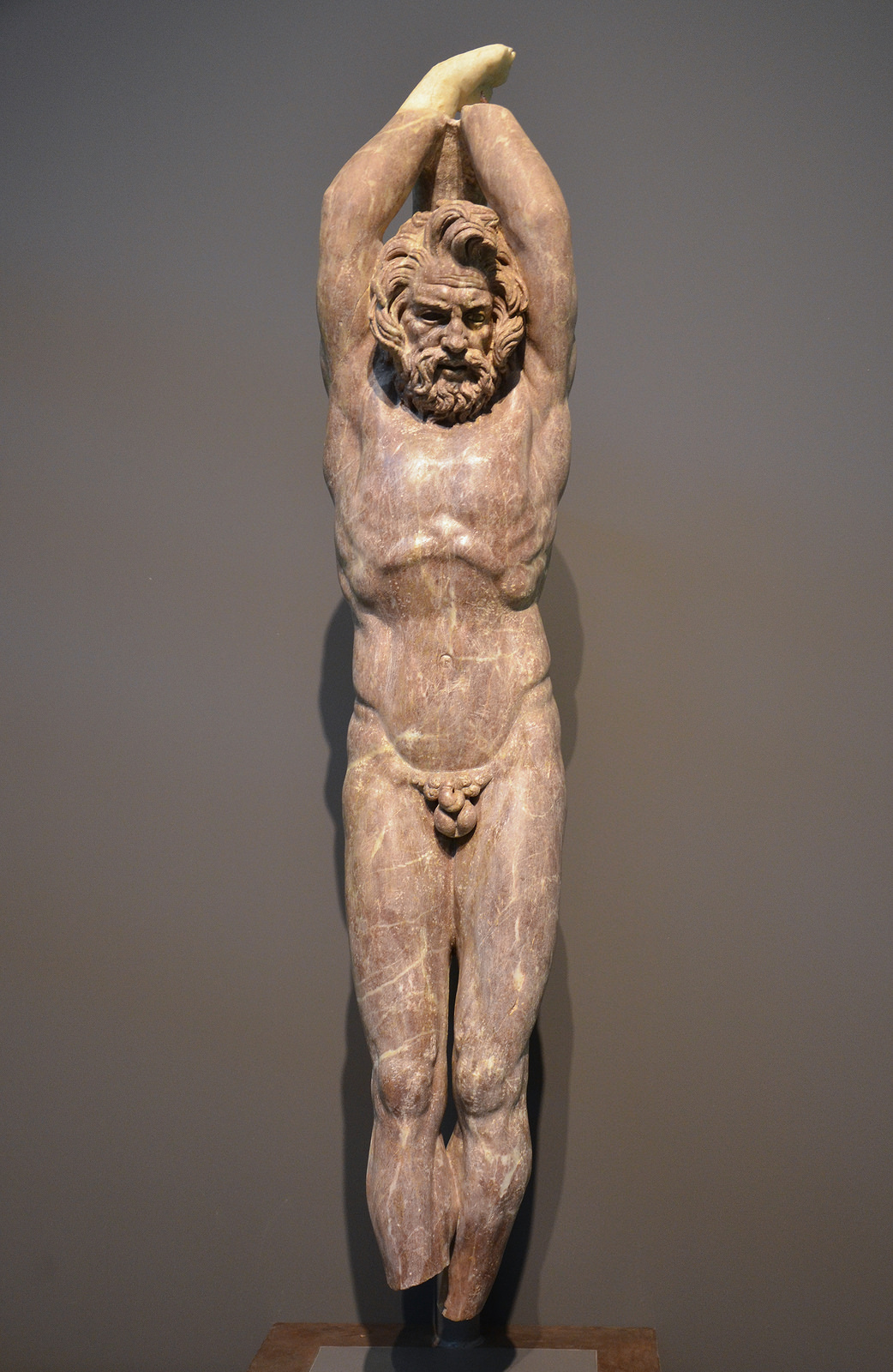 Statue in red marble depicting the punishment of Marsyas, a satyr who dared challenge Apollo to a music contest. Marsyas lost and Apollo had him tied to a tree and flayed him alive. The statue was found at the Villa Vignacce in southeastern Rome during 2009 excavations carried by the American Institute for Roman Culture. Now in Centrale Montemartini, Rome. From the 1st half of 2nd century CE (Hadrian's reign).