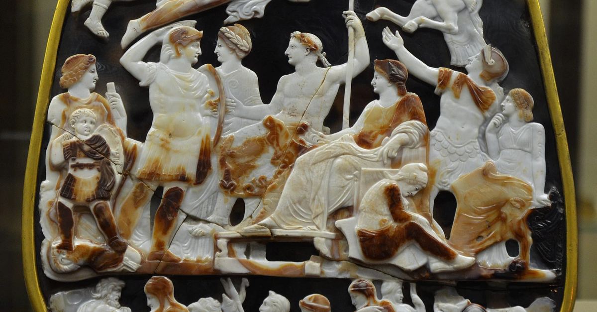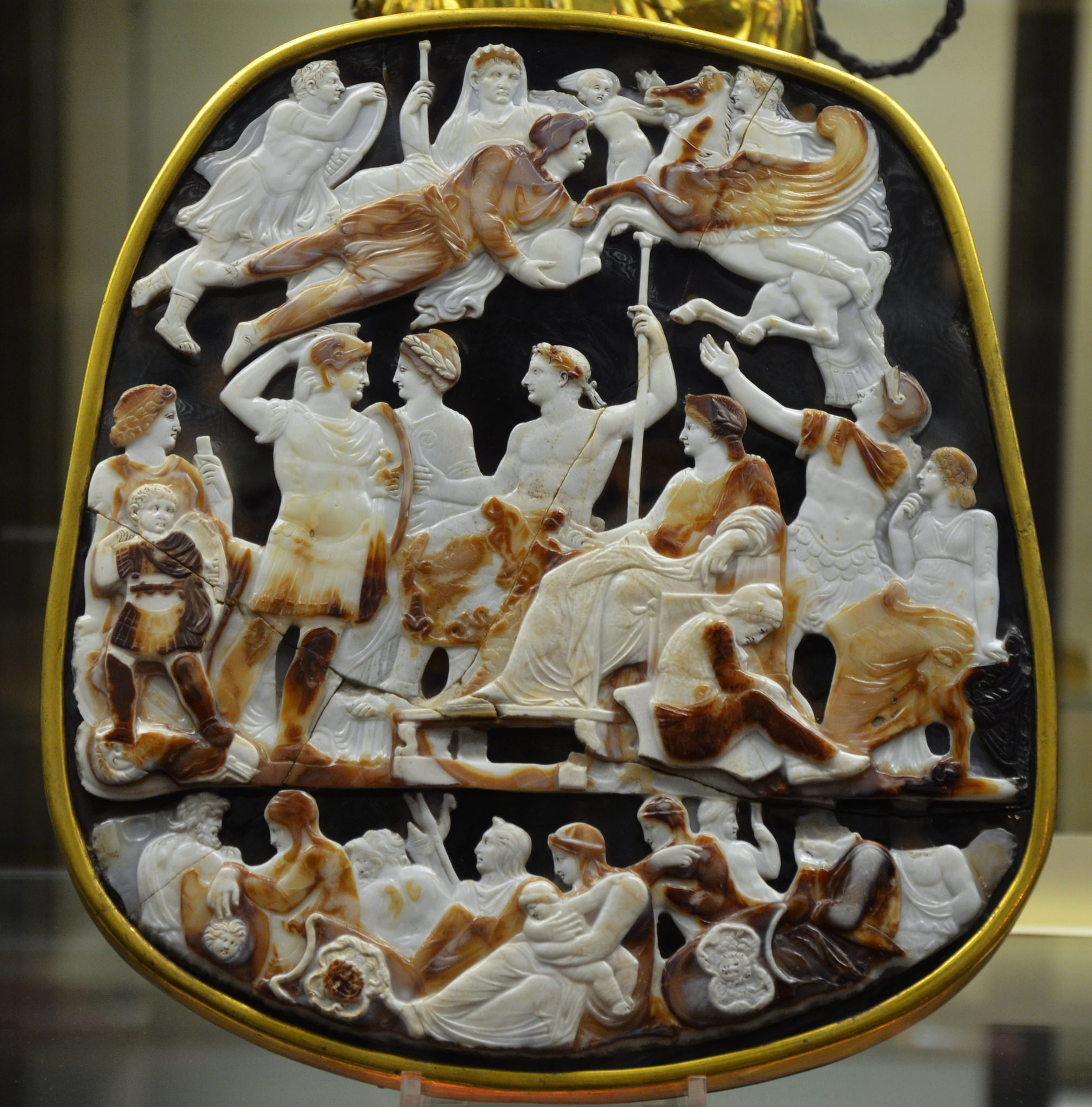 The Great Cameo of France is a five-layered sardonyx cameo divided into three levels which depicts members of the Julio-Claudian dynasty, circa 23 CE. The Great Cameo of France is the largest cameo to survive from the ancient world. It contains 24 engraved figures. The dead are placed in the upper part, while the middle register represents the world of the living. Tiberius in the center of the cameo sits on his throne, along with his mother and the wife of Augustus, Livia. The divine Augustus can be recognized in the upper register, with his head veiled and encircled by a radiant crown. (Cabinet des Médailles, Paris)