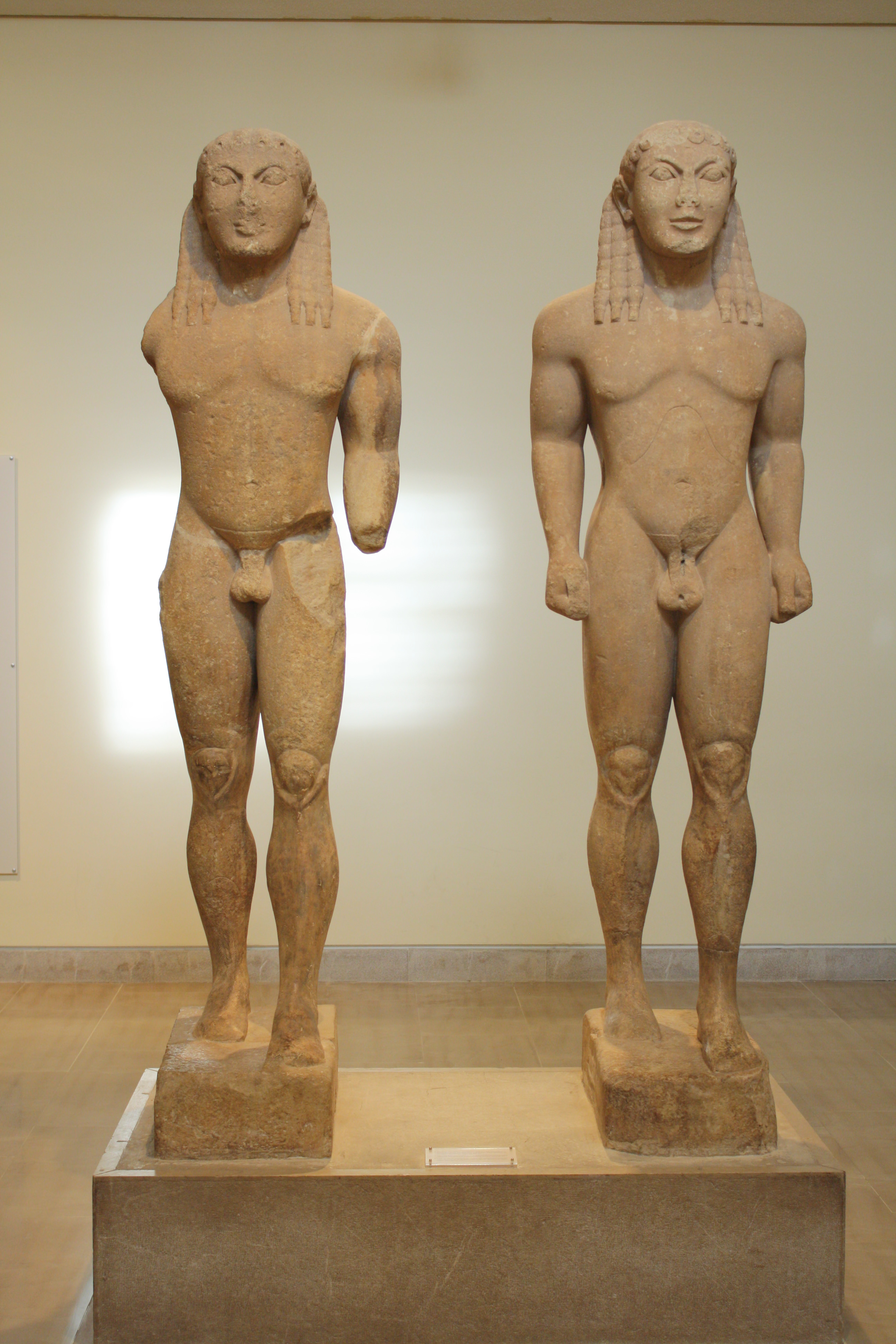 Twin Kouroi of Argos - named Kleobis and Biton - sculpted by Polymedes (c 580 BCE), mature archaic style. Delphi Archaeological Museum, Greece.