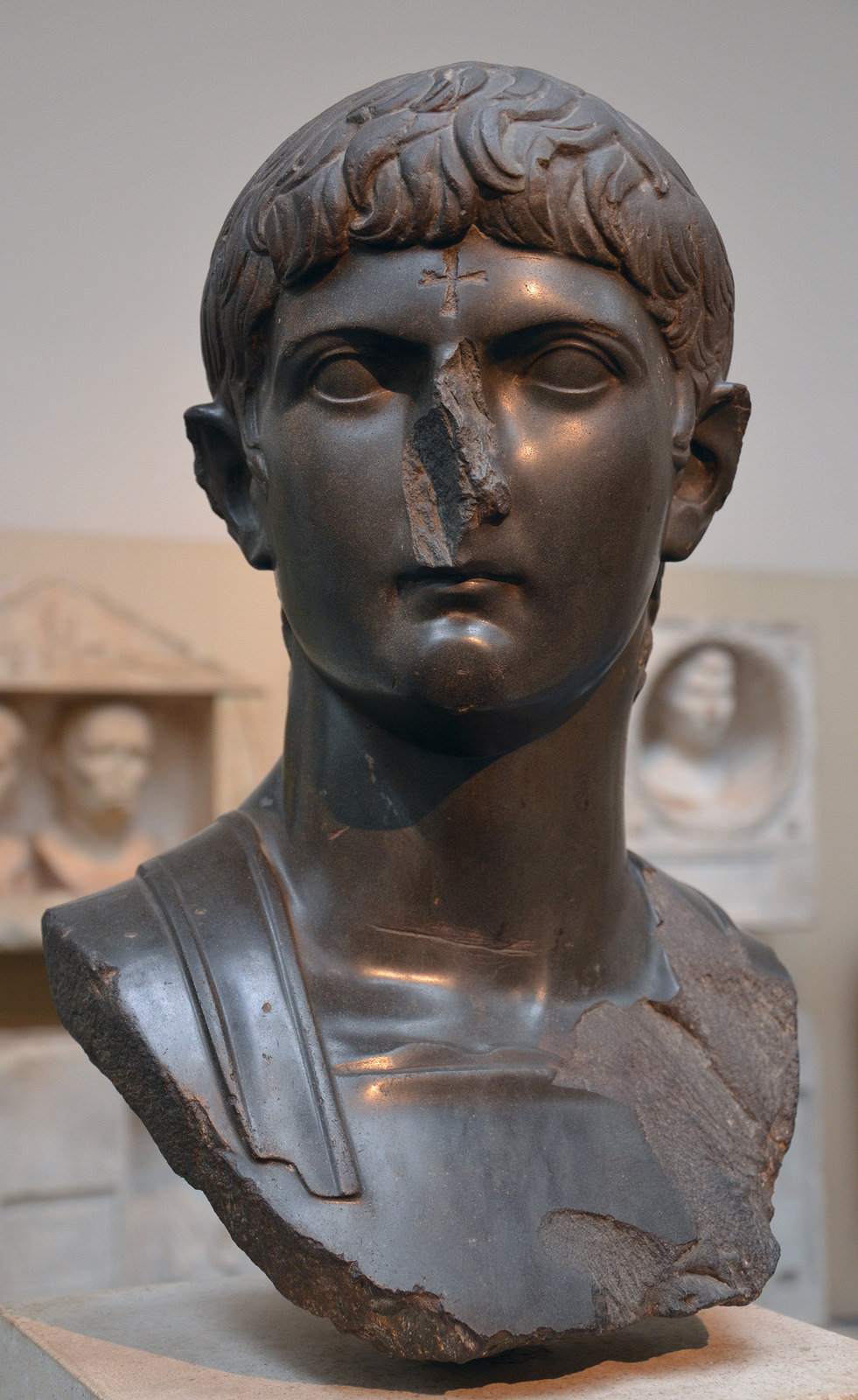 Basalt bust of the great Roman general Germanicus, from Egypt, about 14-20 CE. In late antiquity Christians broke the nose of the bust and carved a cross on the forehead. Now in British Museum, London.