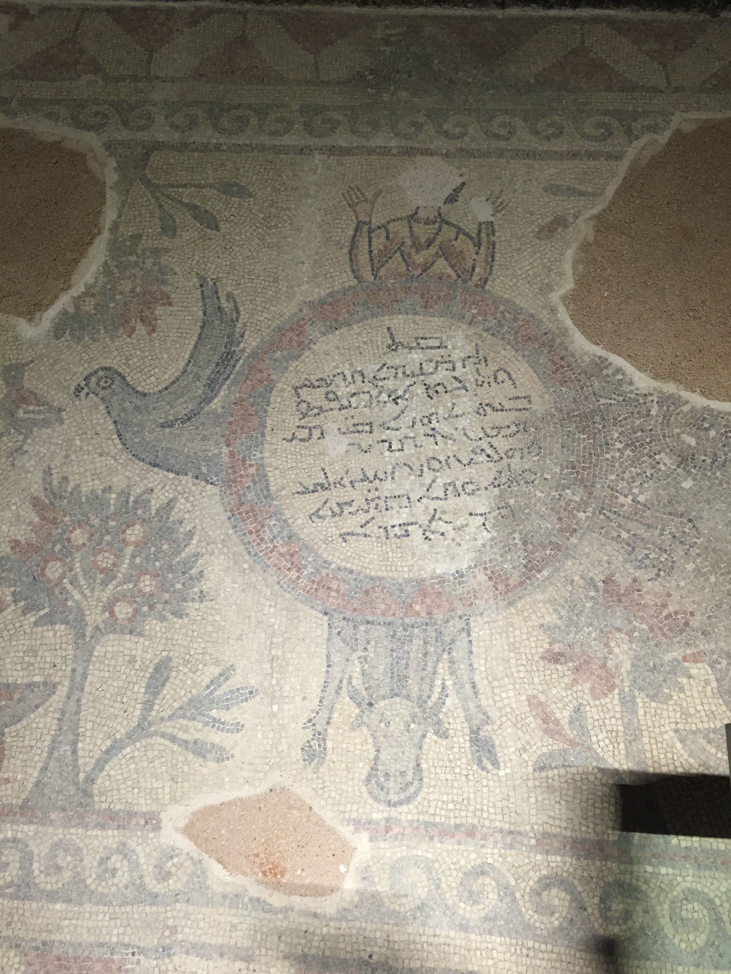 In the center of this mosaic dating from CE 563 is a symbol representing the four apostles who wrote the four gospels found in the New Testament: Matthew is depicted as a lion; Mark is depicted as an ox; Luke is depicted as a man; and John is depicted as an eagle. Within the frame, a Syriac description reads, "this house was built in CE 563 during the days of Abbot Sam by Helpidus and Yuhannus."