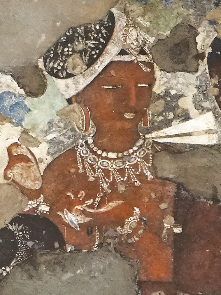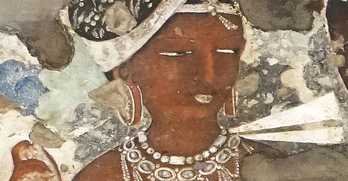 Some of the most evocative murals were created on the walls of the Ajanta Caves (Maharashtra, India) between 2nd century BCE and 6th century CE. The expressive face, playfulness of light and shade and presence of lustrous jewellery make this portrait extra special.