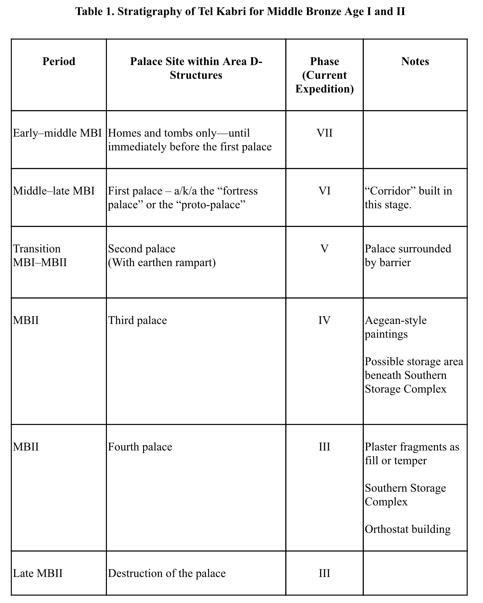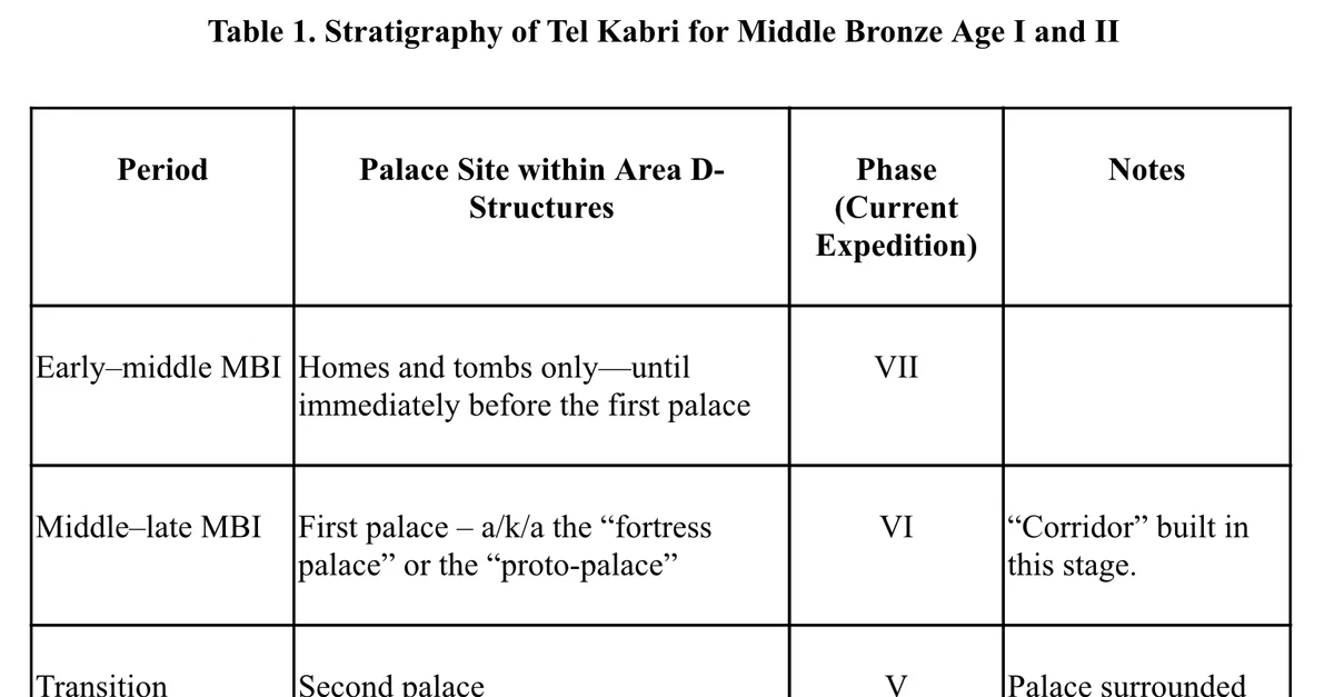 A table of Tel Kabri's stratigraphy for Middle Bronze Age I and II. Source: Yasur-Landau et al. 2014, 356-364; Kempinski 2002, 4-5 Yasur-Landau et al. 2012, 3.