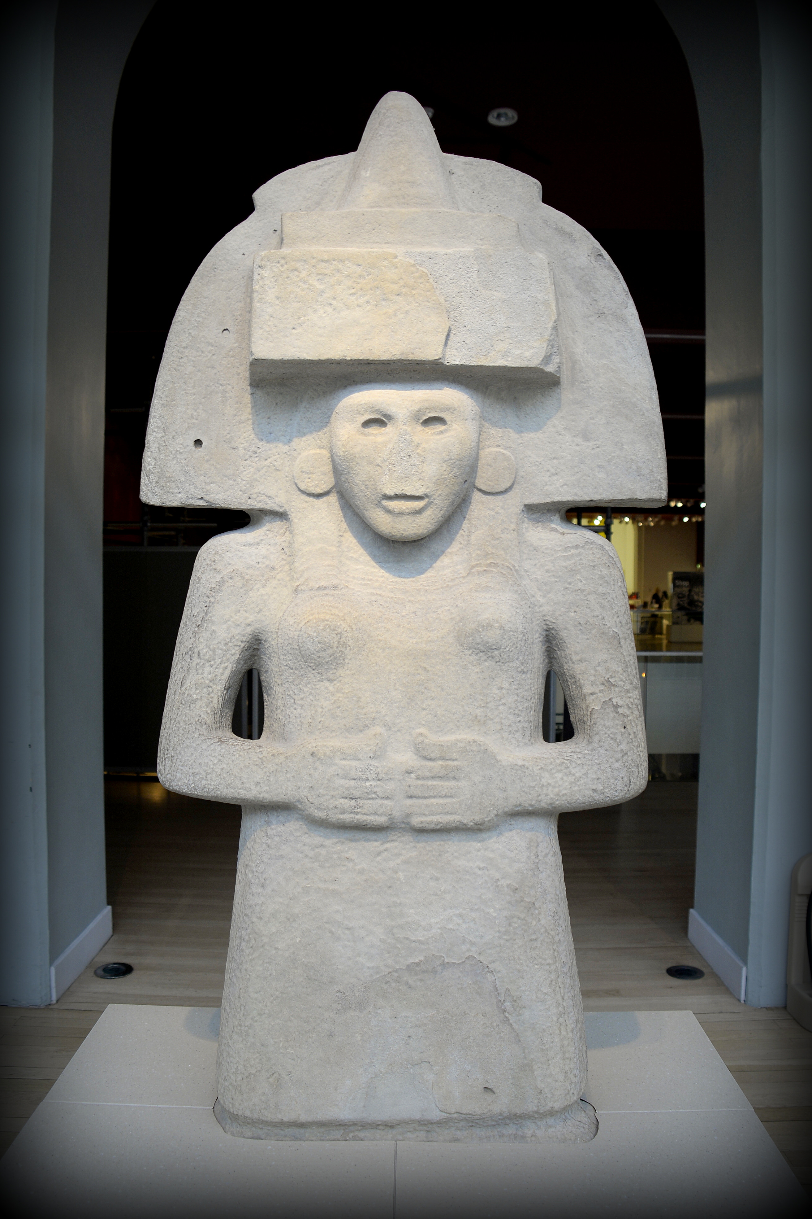 This limestone statue was made by Huastec people. Those were Mayan Indians who lived in ancient Mexico. After their conquest by Aztecs about 1450 CE, the Huastec mother goddess merged to some degree with Tiazolteoti (an Aztec goddess). From ancient Mexico, circa 900 CE. National Museum of Scotland, Edinburgh, UK.