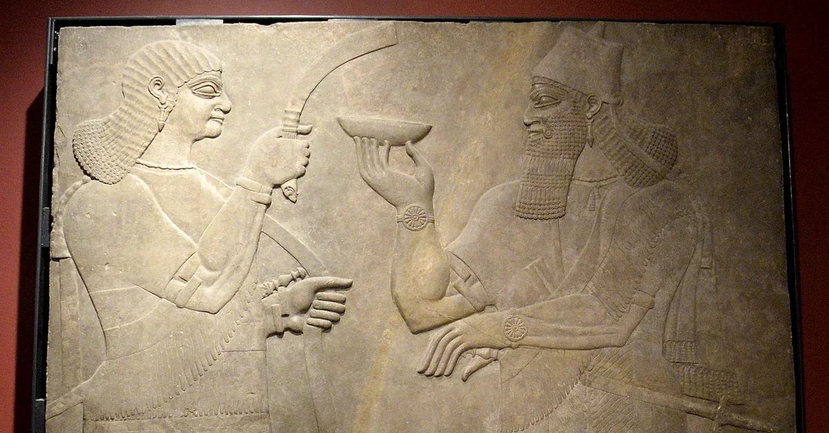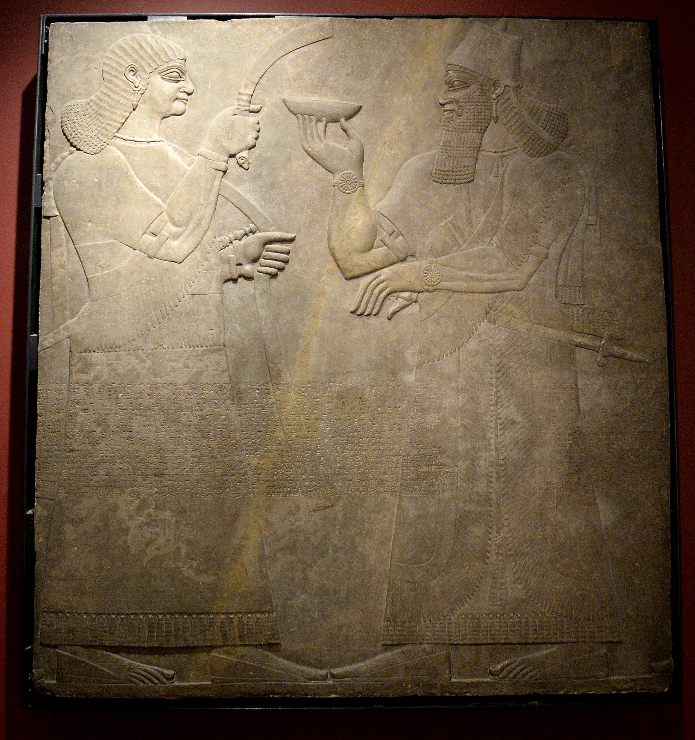 This alabaster bas-relief depicts the Assyrian king Ashurnasirpal II praying in a religious ceremony. The king (right) holds a bowl (filled with a fluid) with his right hand and puts his left hand on his sword hilt. Before him, a royal attendant (or priest) holds a whisk (made of reeds or branches) as part of the ritual. The "Standard Inscription of Ashurnasirpal II" runs across the relief horizontally. The panel was a donation From the Scottish obstetrician Sir James Young Simpson (1811-1870) to the Society of Antiquities of Scotland in 1865 CE. Dr. Simpson was very interested in archaeology. From the north-west palace at Nimrud, Mesopotamia, modern-day Iraq. Neo-Assyrian period, 9th century BCE. (National Museum of Scotland, Edinburgh, UK)