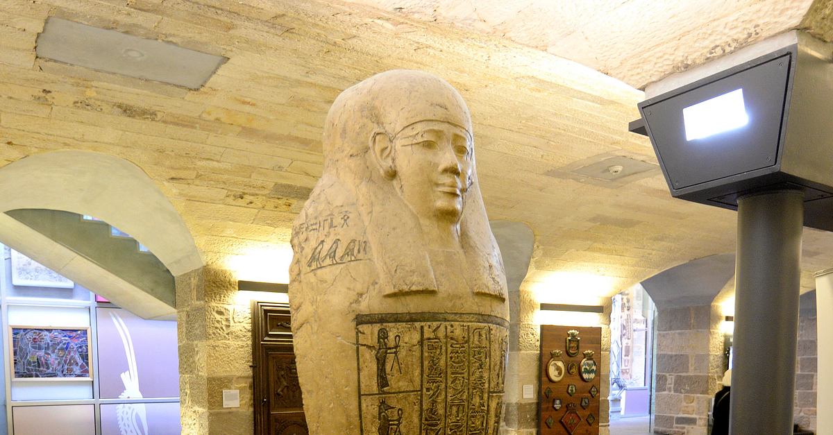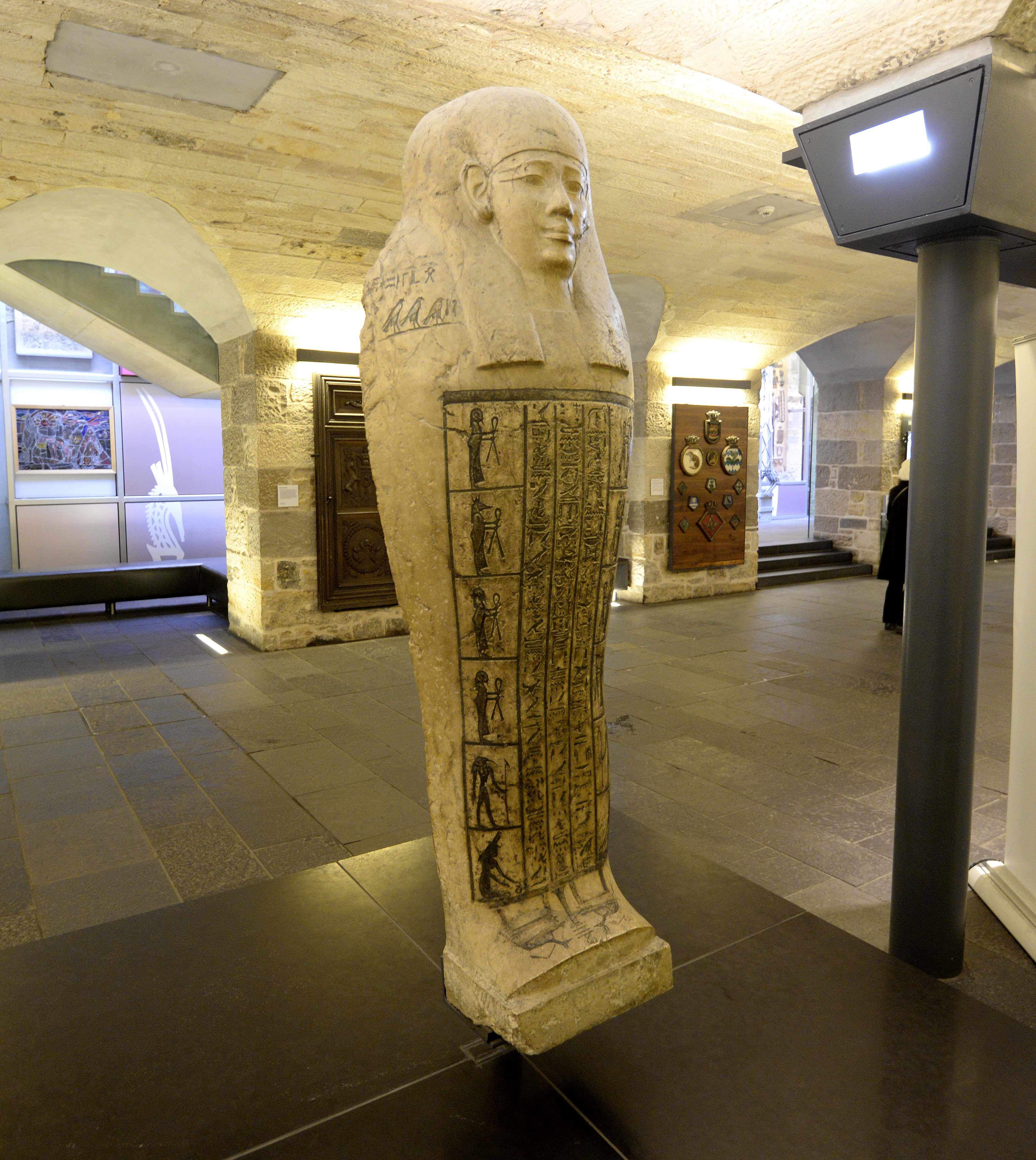 The hieroglyphs running down this limestone coffin lid in 3 columns state that the coffin contains the remains of Paamennesutawy, son of Horiru and the Lady of the Estate Nubty. The figures down either side of the text are representations of various protective funerary deities; Nephthys and her sister Isis can be seen. The lid was purchased by the National Museum of Scotland in 1908 CE. Egypt, early Ptolemaic period, 221-180 BCE. (National Museum of Scotland, Edinburgh, UK)