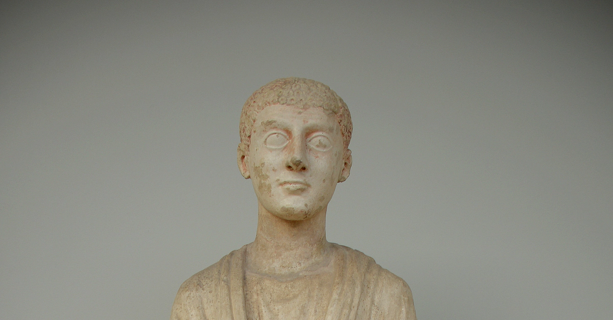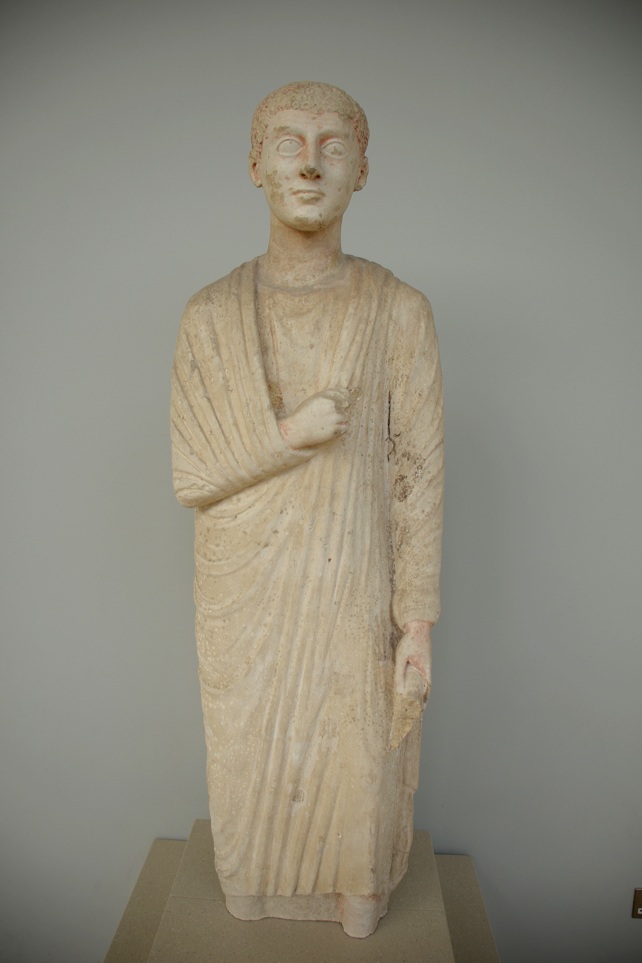 This limestone statue depicts a citizen from the city of Oxyrhynchus (part of modern-day El-Bahnasa, Egypt). Traces of the original colors can still be seen. The man wears a toga dress. The city developed a culture influenced by Greece and Rome; this is clearly reflected in the man's toga. Egypt, 300-200 BCE. (National Museum of Scotland, Edinburgh, UK)