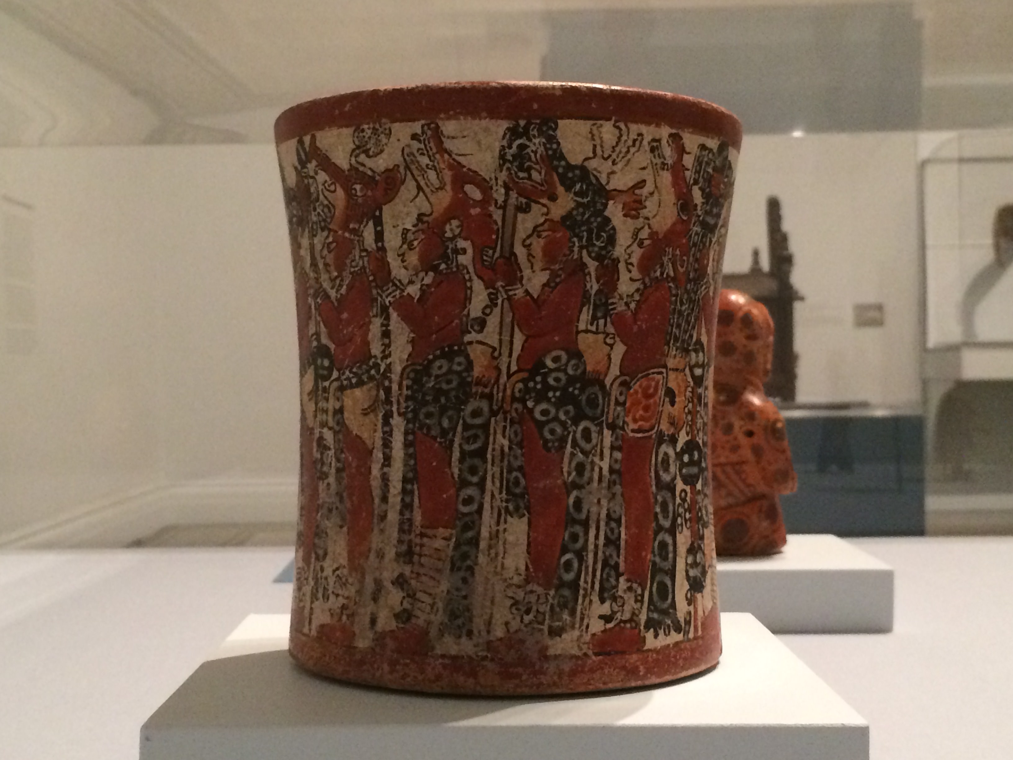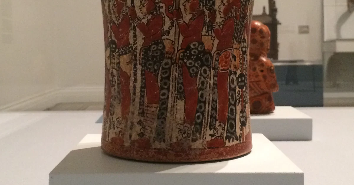 A Maya vessel decorated with warrior figures. They are wearing animal headdresses and have trophy heads hanging from their belts. From Mexico or Guatemala, c. 600-800 CE. (Brooklyn Museum, New York)