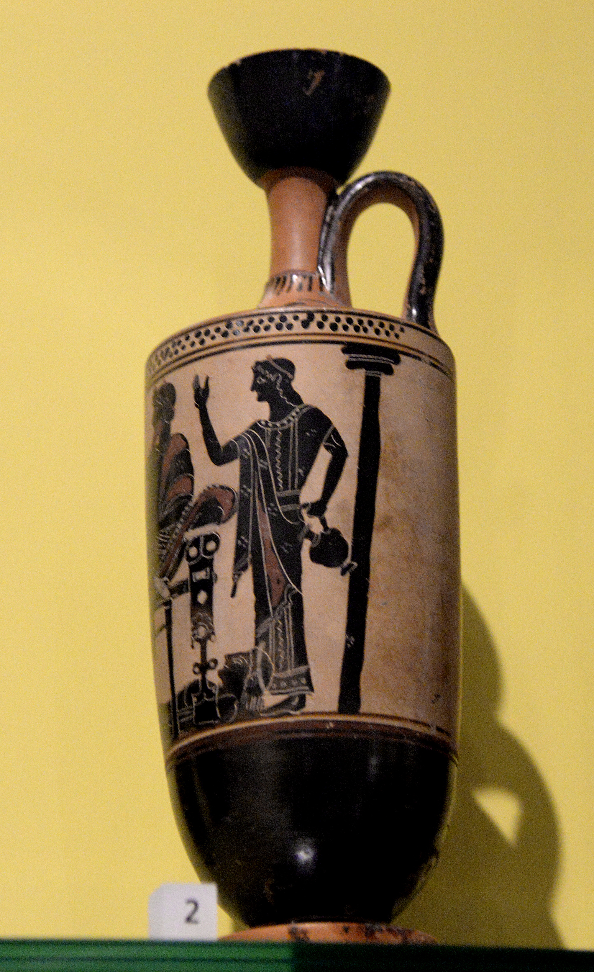 Oil, especially olive oil, was stored in specialized Greek pottery; lekythos (pleural, lekythoi). Many lekythoi were found inside tombs; they were used to anoint the dead bodies of single men. Mainly dull red and black paints were used by artists to decorate these ceramics. Prince Hector was the son of king Priam and queen Hecuba of Trojan. He was the greatest fighter for Troy during the Trojan War. Attica, Greece, circa 500 BCE. (National Museum of Scotland, Edinburgh, UK)